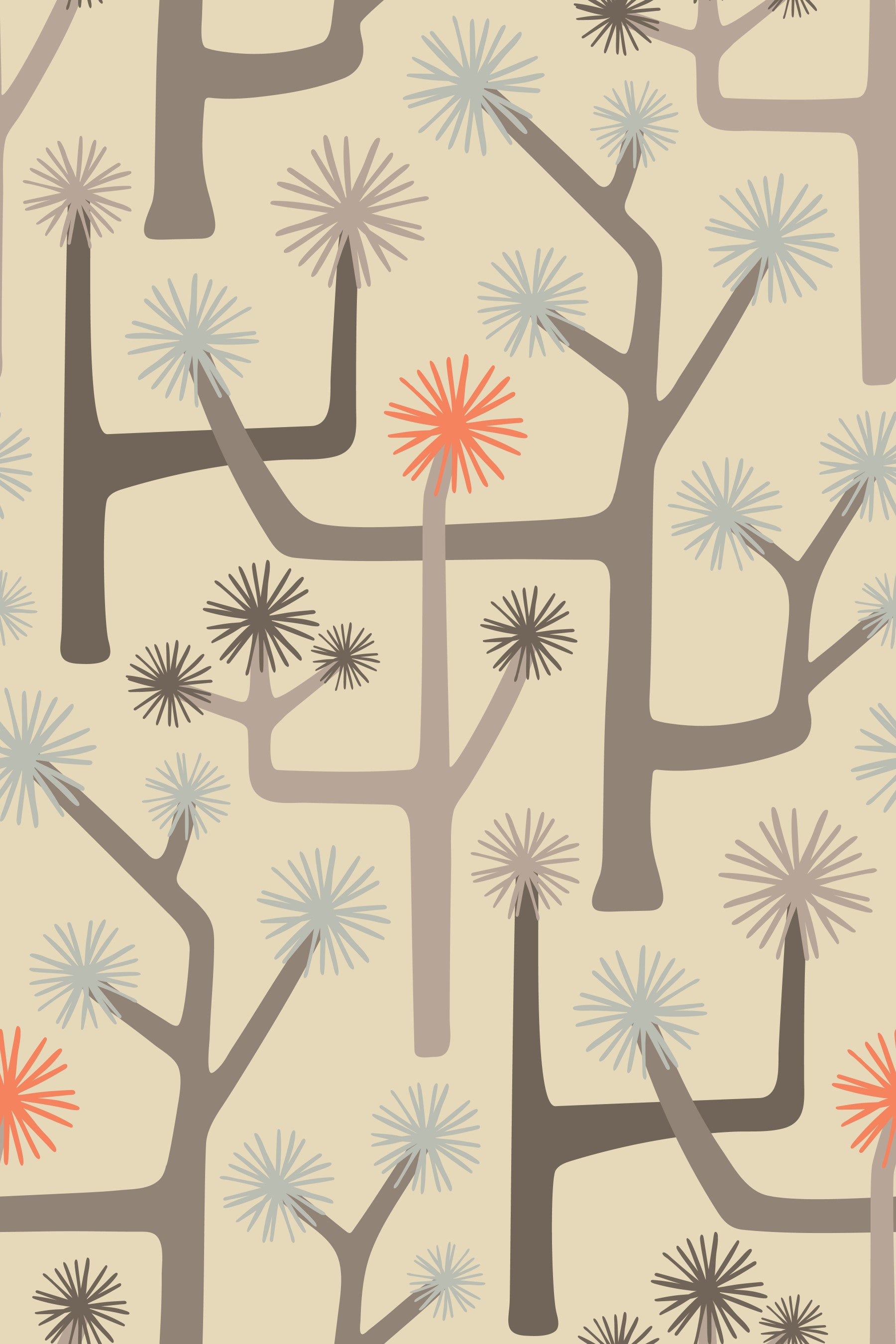 Evoke the warm sun-drenched spirit of the desert with this Joshua Tree wallpaper that draws inspiration from the iconic landscapes of Joshua Tree National Park, Mid-Century Modern design and Palm Springs style. Rendered in a palette of vintage-inspired hues, including warm earth tones, light gray and orange on a neutral sand background, "Joshua Tree" captures the essence of warm desert dunes. Clean lines and organic abstract shapes create a visually striking and timeless design, perfect for adding a touch of retro charm to any space, from living rooms and bedrooms to offices and studios. Let this wallpaper transport you to the cool, modern heart of the mid-century desert. This pattern design is also available in Other Colourways too! Original wallpaper pattern design by Jackie Tahara of UnBlink Studio.