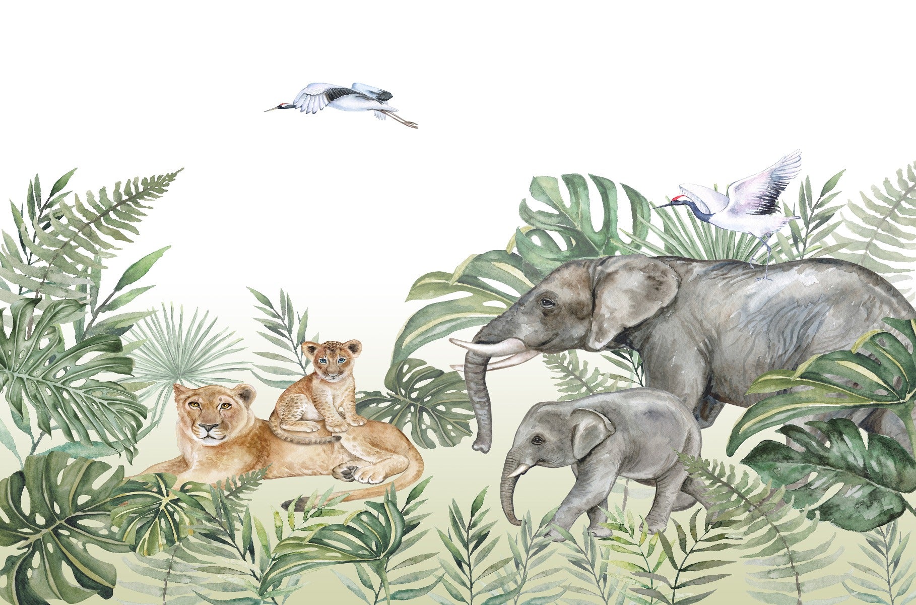 Unleash your child's wild imagination with our watercolor royal jungle safar imural wallpaper! This playful and vibrant wallpaper is perfect for bringing some jungle adventure to your child's playroom. The beautiful watercolor effect adds a lovely touch of natural beauty to the room, while the safari animals like elephants, giraffes, and zebras create a sense of excitement and wonder. Your child will have endless fun exploring this wallpaper and creating their own jungle stories.