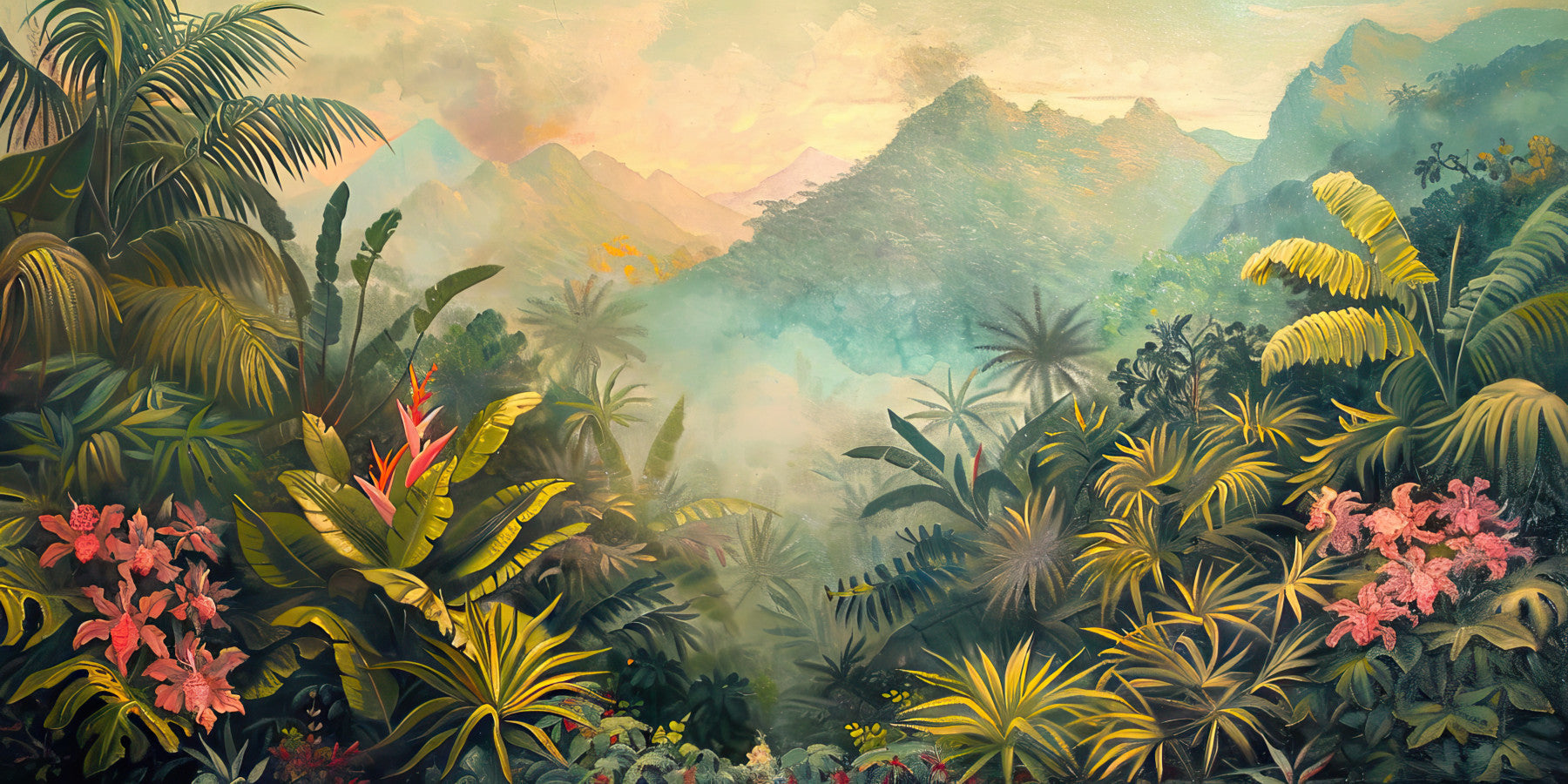 Bring a lush escape to your home with this enchanting jungle bloom scene. It features vivid greens, rich yellows, and vibrant pink flowers. The misty mountains in the background add depth, creating a peaceful and artistic look. This wallpaper for walls elevates any room, from a bedroom to a dining area. Its detailed, painterly style creates a striking feature, while the calm, natural tones blend well with a variety of interior designs, adding a touch of the exotic to your space.