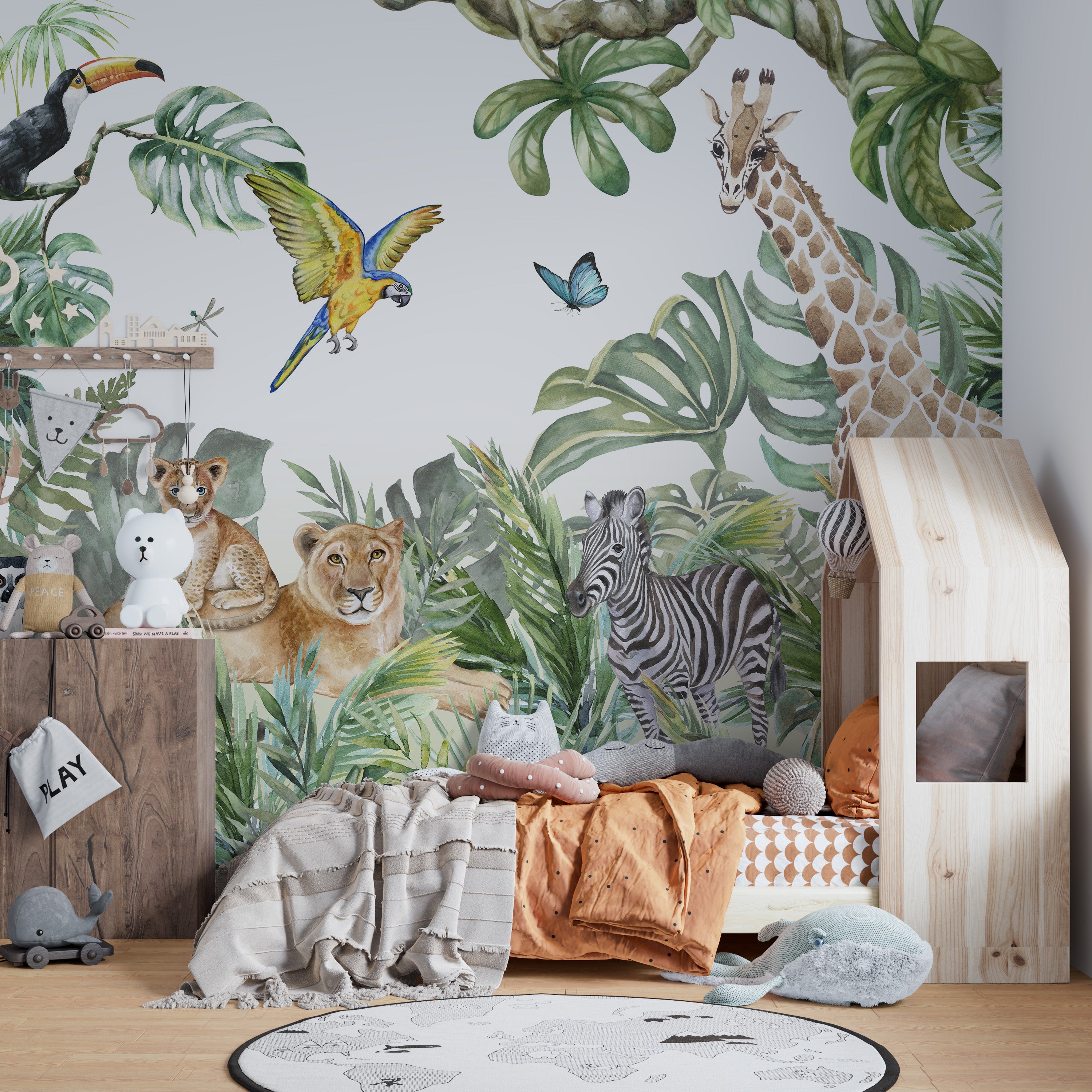 Step into an exotic wilderness with this animals jungle book peel and stick mural wallpaper. The vibrant tropical jungle and the acrobatic safari animals featured in it will undoubtedly spark a sense of adventure in your little ones, making this an excellent choice for a playroom wallpaper. Your kids can dream up all sorts of jungle-filled scenarios featuring giraffes, lions, and zebras. Each animal is expertly depicted in their natural habitat, adding an extra layer of excitement to the mural. The lush vegetation and colorful parrots bring so much life to the design that your children will feel like they've been transported to an actual rainforest. This wallpaper is perfect for creating a playful atmosphere that your kids will adore.