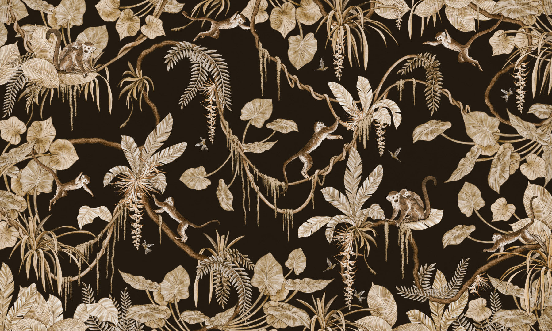 Transform your space with this captivating jungle-themed wallpaper for walls. It features playful monkeys, lush leaves, and delicate hummingbirds in soothing beige tones against a dark backdrop. This design offers a unique twist on traditional jungle motifs. It adds a touch of exotic charm and visual depth. Perfect for living rooms, bedrooms, or nurseries, it creates a sophisticated yet playful atmosphere and complements both modern and classic interiors.