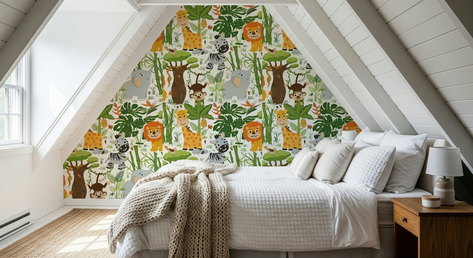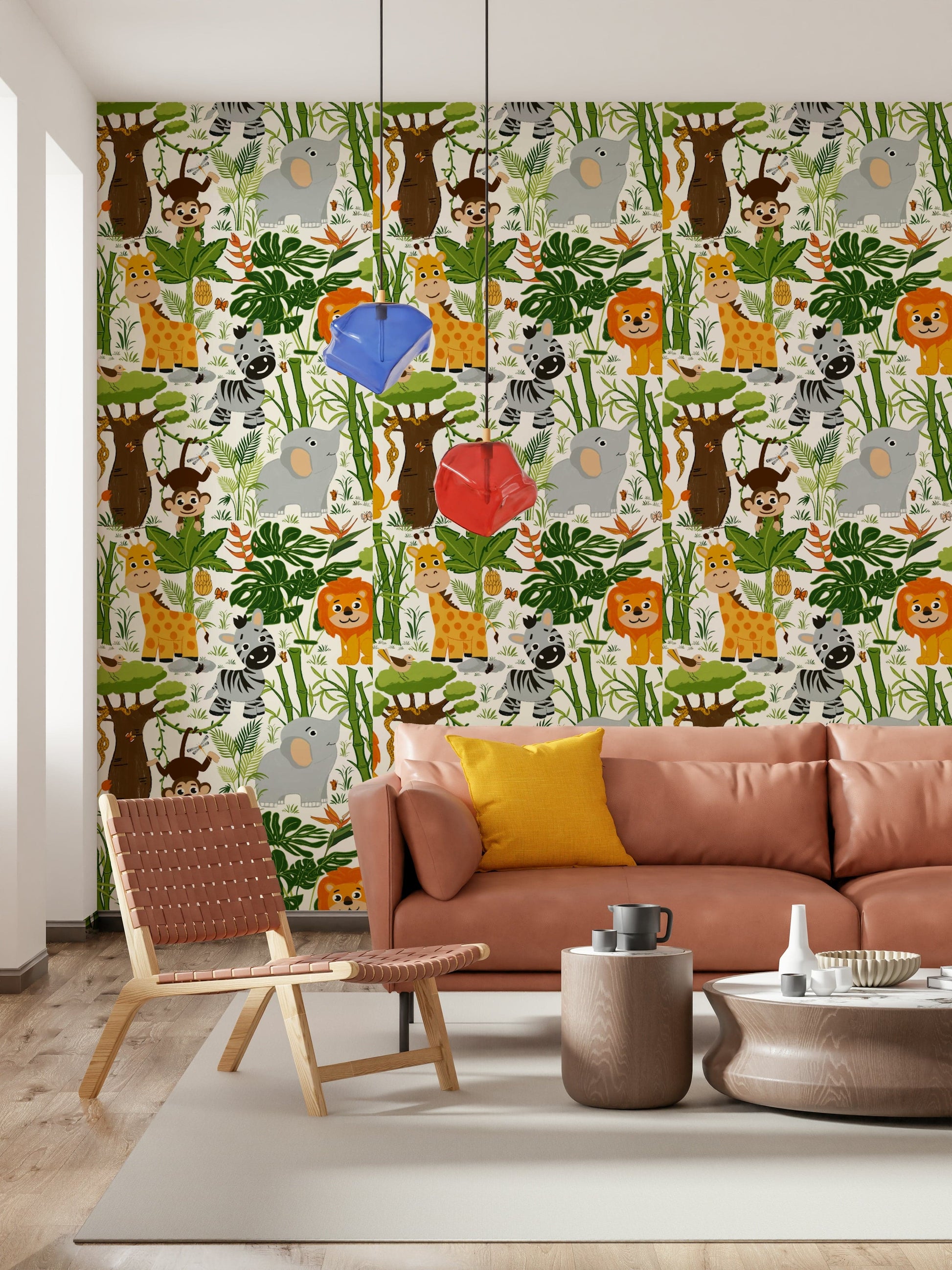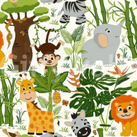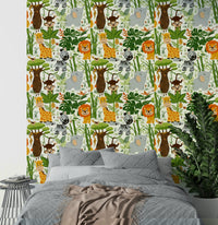 Bring the jungle to life with this cheerful animal-themed wallpaper for walls. The cartoon style and soft hues make it perfect for a nursery or kids' room. Feature elephants, giraffes, zebras, and lions nestled among lush greenery. Its playful design complements fun and adventurous interiors. This wallpaper sparks joy and creates a lively atmosphere. It blends well with light furniture and colourful decor, inviting children to explore their imagination within the comfort of their own space.