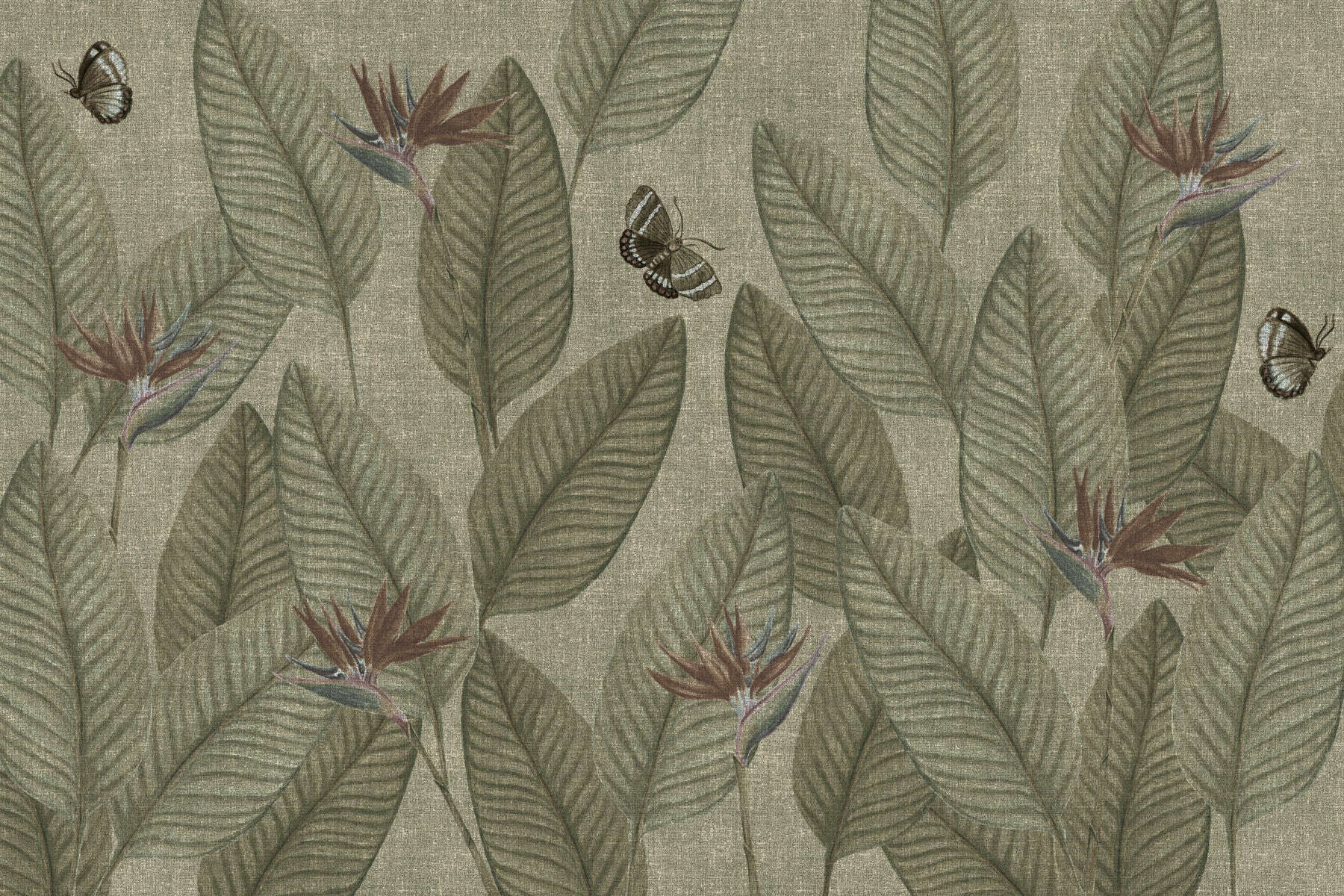 Step back in time with "Jungle Life Antique," a wallpaper that evokes the charm of vintage botanical prints. This design features a dense arrangement of oversized leaves, rendered in muted, earthy tones, suggesting a forgotten corner of a tropical paradise. The occasional vibrant Bird of Paradise flower adds a touch of exoticism, while delicately illustrated butterflies flutter amongst the foliage, lending an air of timeless elegance. The textured background mimics antique linen, enhancing the wallpaper's vintage aesthetic and creating a tactile impression of age and history. Ideal for creating a sophisticated and calming ambiance, "Jungle Life Antique" brings the allure of a bygone era into your modern space, blending natural beauty with classic design sensibilities. Let this enchanting wallpaper transport you to a world of serene beauty and timeless charm.