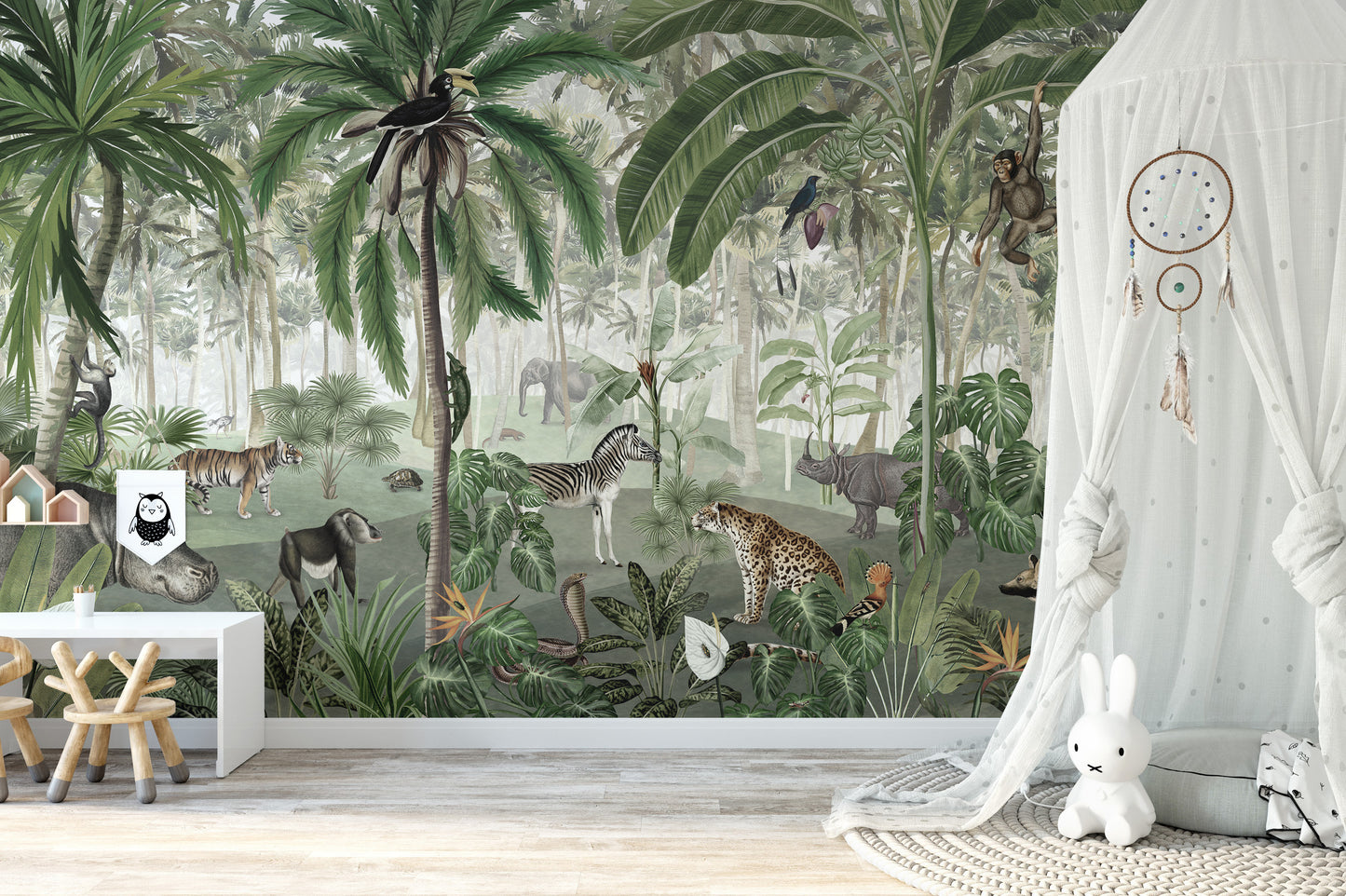 Transform your little one's nursery into an enchanting jungle adventure with our Jungle Lookbook Wallpaper Murals. This captivating design features a rich array of jungle animals and scenery, perfect for sparking imagination and wonder. The playful illustrations and vibrant colors create a friendly and stimulating environment, encouraging exploration and learning. Ideal for nurturing a love for nature and adventure, this kids room wallpaper mural turns any nursery or kids' room into a delightful jungle playground. Let the Jungle Lookbook inspire countless stories and dreams in your child's early years.