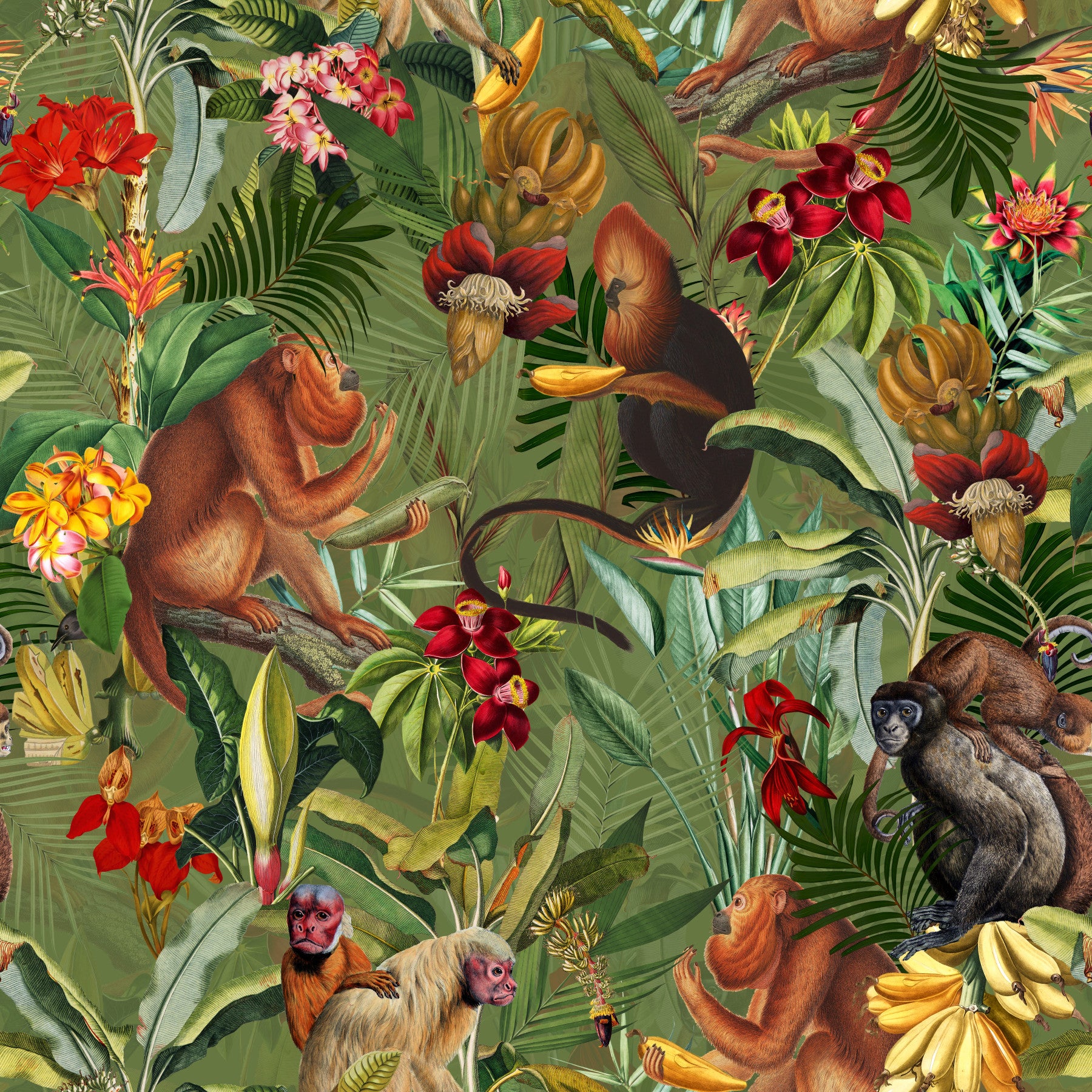 Immerse yourself in the vibrant heart of the rainforest with this captivating wallpaper. Intricate botanical illustrations of lush tropical foliage, banana bunches, and exotic flowers intertwine with exquisitely detailed depictions of monkeys playfully interacting amidst the verdant paradise. The rich, earthy greens form a harmonious backdrop, enhanced by pops of crimson, gold, and the warm tones of the primate's fur. This wallpaper evokes a sense of tranquility and adventure, transporting you to a world of natural beauty and vibrant life. Perfect for adding a touch of exotic elegance to any space.