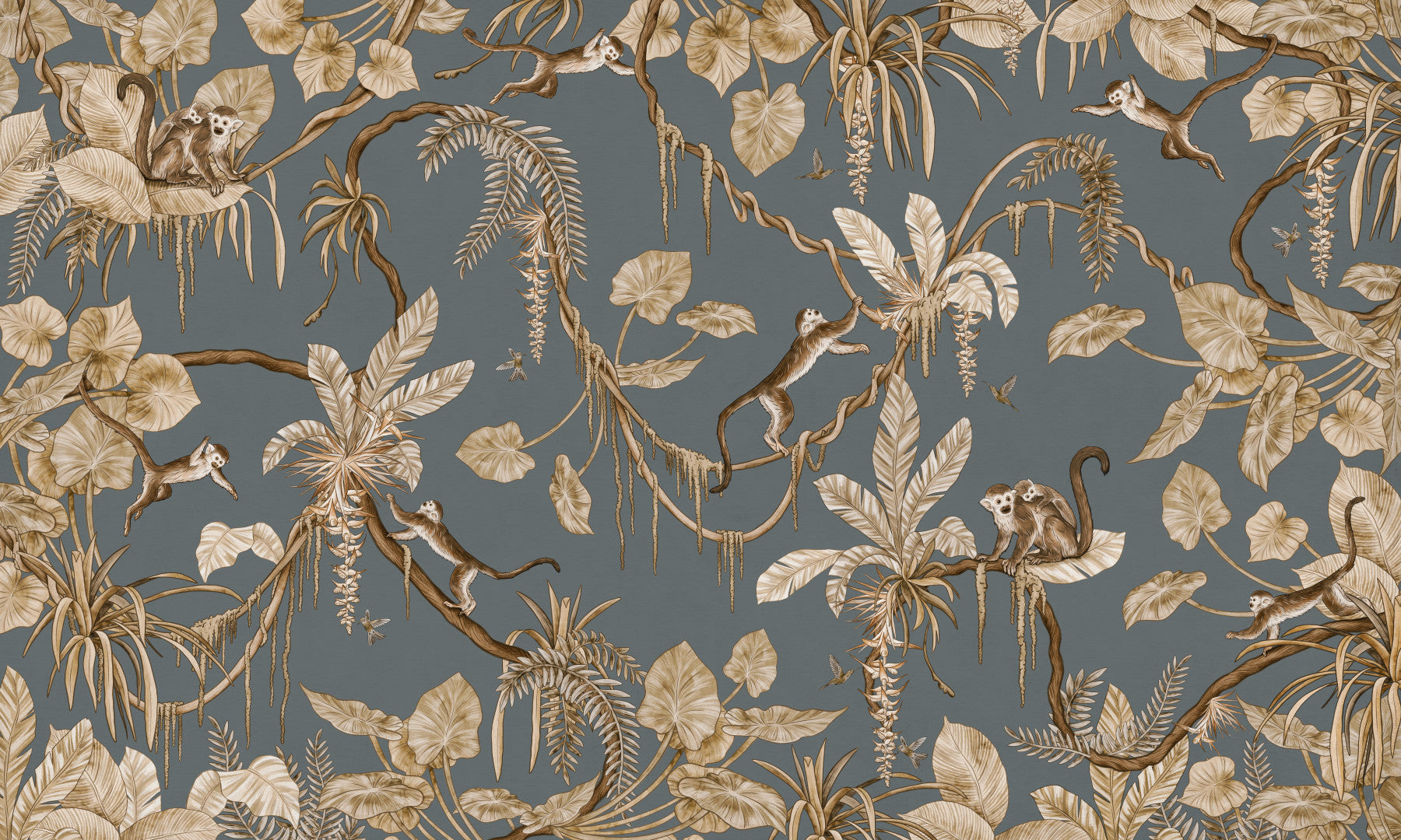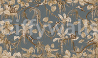 Invite a playful paradise into your home with this detailed jungle scene. Monkeys swing amidst tropical foliage in shades of taupe and brown against a cool grey backdrop. This wallpaper for walls captures a whimsical charm, perfect for a nursery, living room, or bedroom. Let this design transform your interiors with a touch of exotic flair, providing an enchanting atmosphere that feels both sophisticated and inviting.
