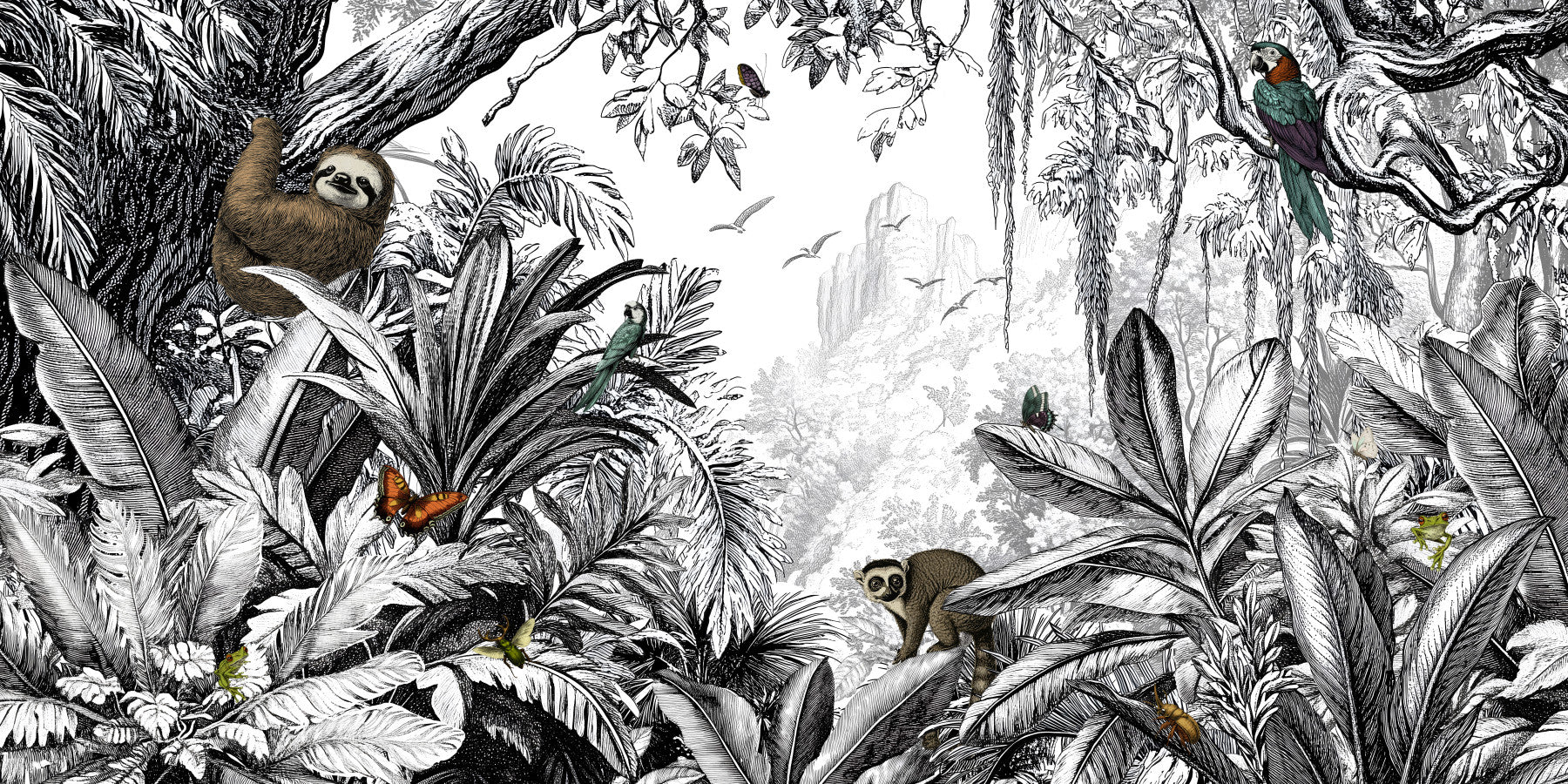Immerse yourself in a dense tropical jungle atmosphere, teeming with wild animals and beautiful butterflies. Drawn in an antique natural history style, this black and white, junglecore mural illustration features an adorable sloth, cheeky lemur, colorful macaw parrot and even more creatures, rendered in full color, hidden in the lush foliage. Your room will take on a magical, richly historic feeling with this beautiful Jungle Vista mural.