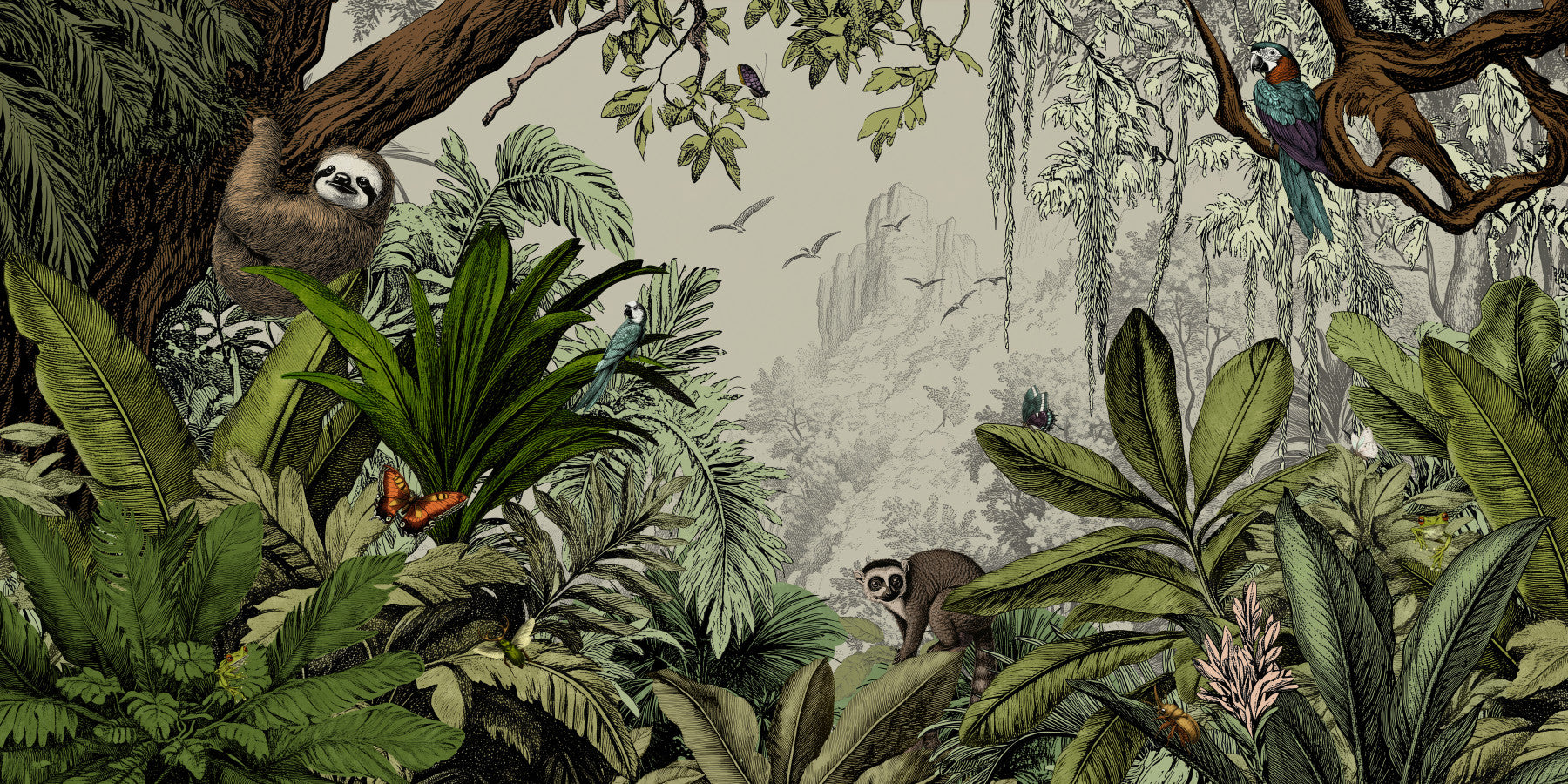 Immerse yourself in a dense tropical jungle atmosphere, teeming with wild animals and beautiful butterflies. Drawn in an antique natural history style, this junglecore illustration features an adorable sloth, cheeky lemur, colorful macaw parrot and even more creatures hidden in the lush green foliage. Your room will take on a magical, richly historic feeling with this beautiful Jungle Vista mural.
