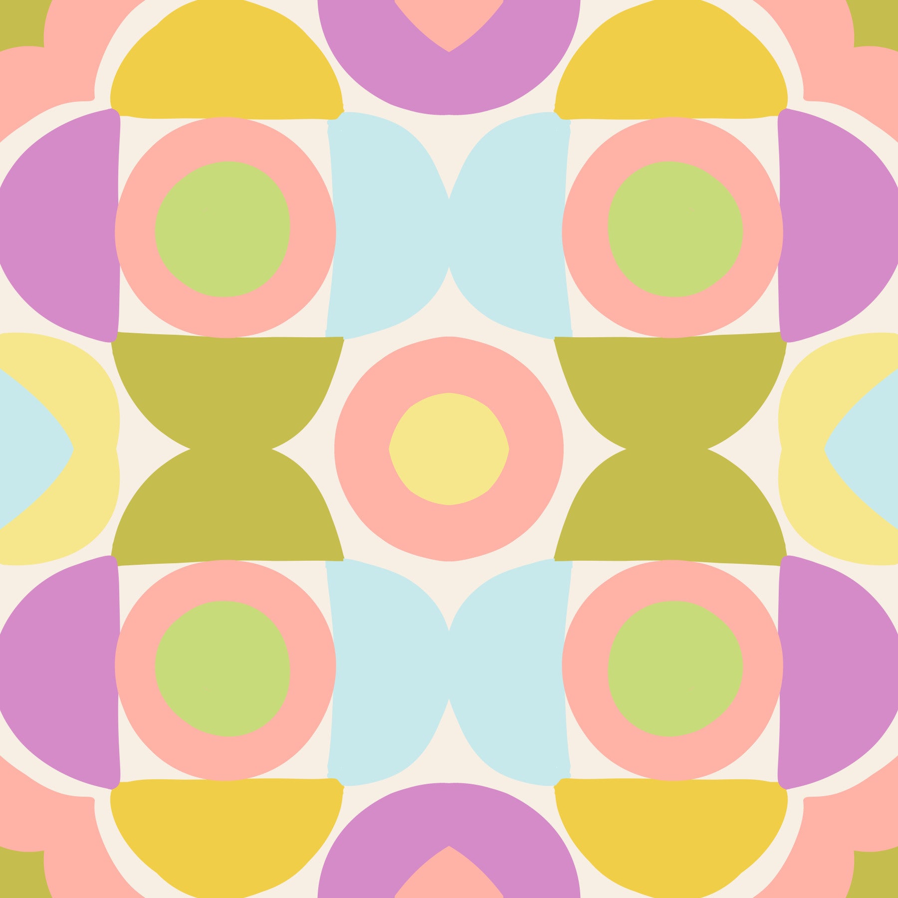 Dive into the playful world of 'Kaleidoscope Kisses' a wallpaper that brings a touch of retro charm to modern spaces. Featuring rounded shapes in soft pastel colors, including light blues, peaches, and yellows, arranged in a balanced, symmetrical pattern, this design evokes a feeling of harmony and joy. Ideal for a kids room or a fun-loving living space, its gentle tones and playful forms create a cheerful and inviting atmosphere. Embrace the whimsy and add a splash of vintage elegance to your home with this delightful, repeating pattern.