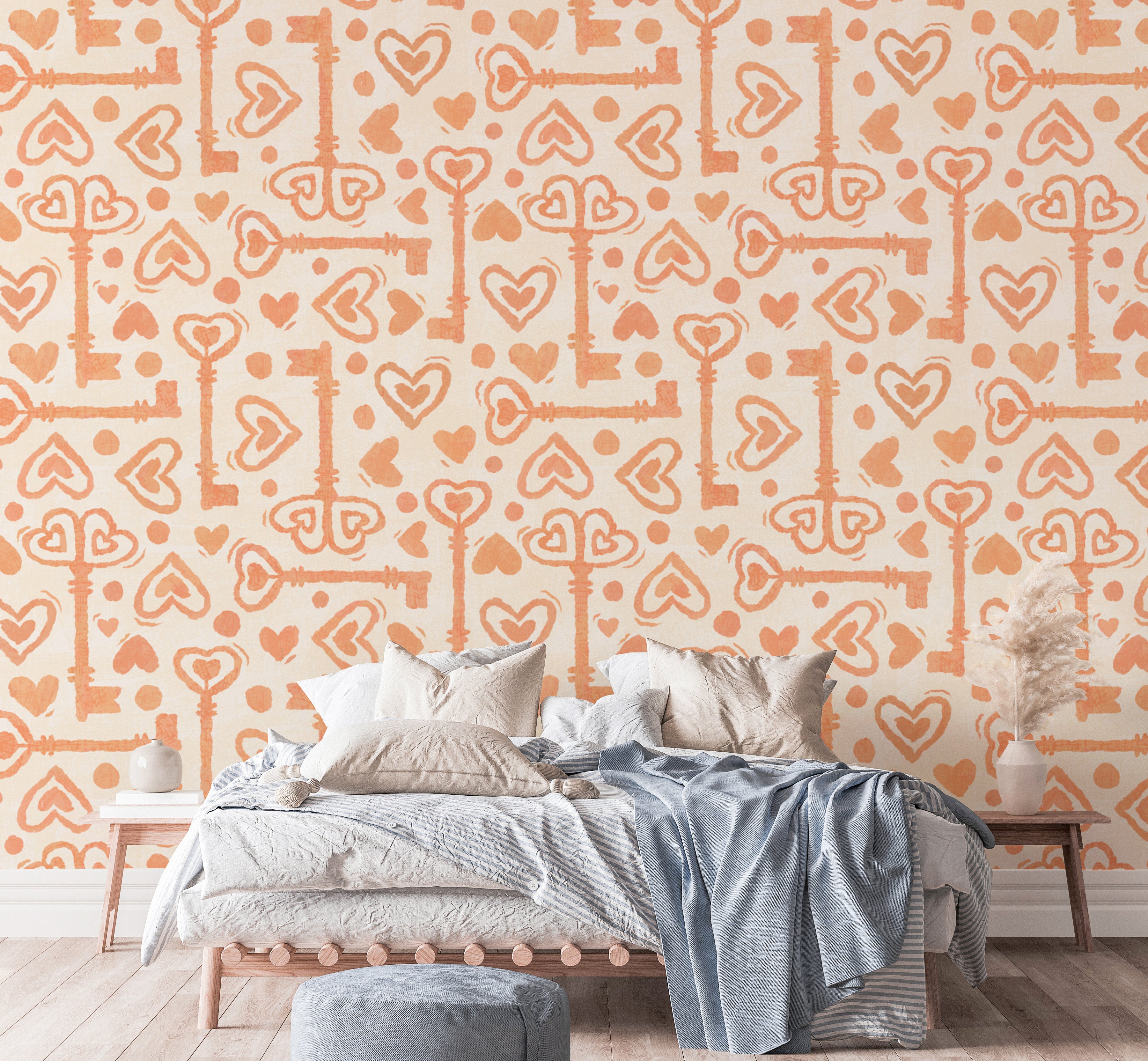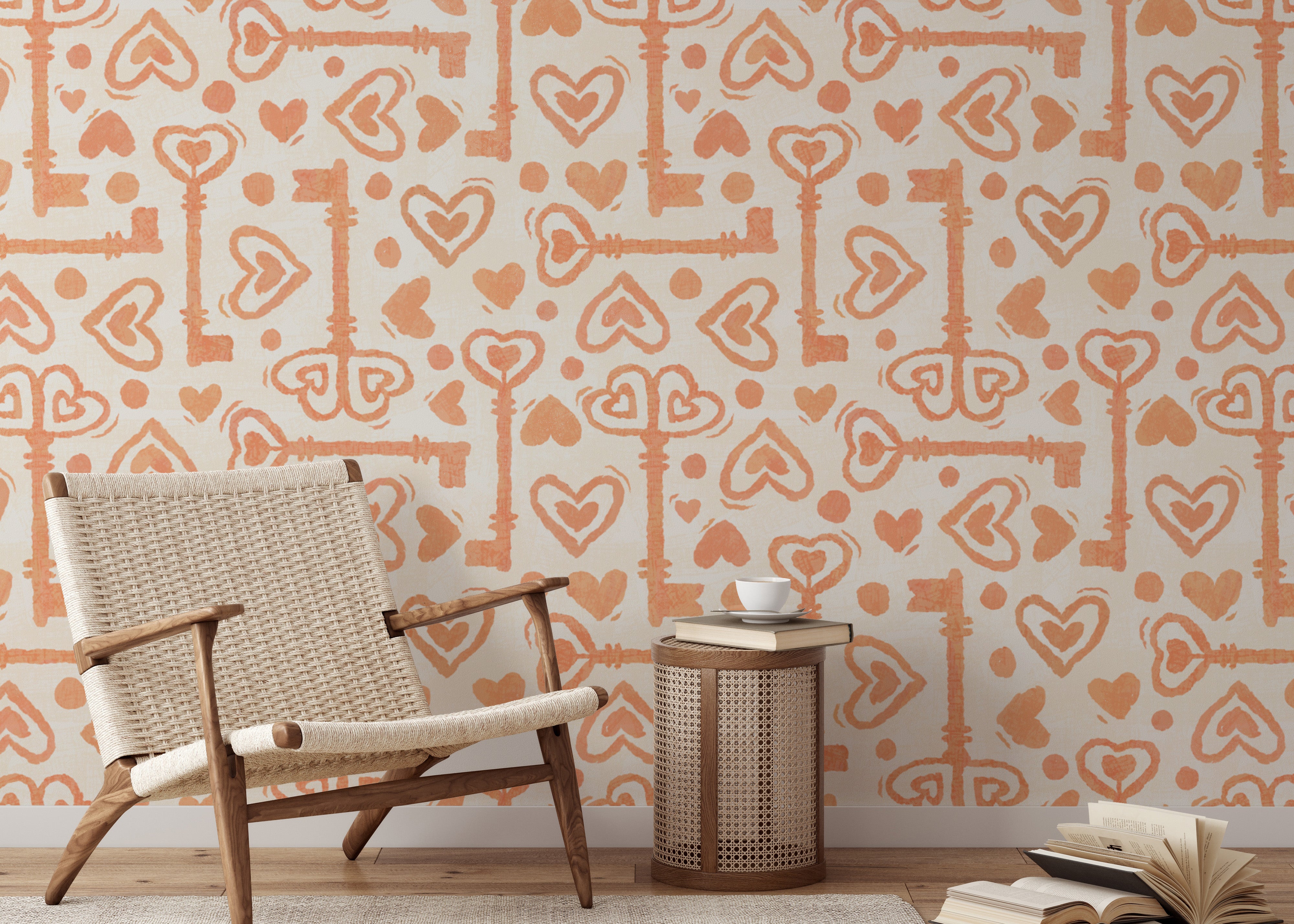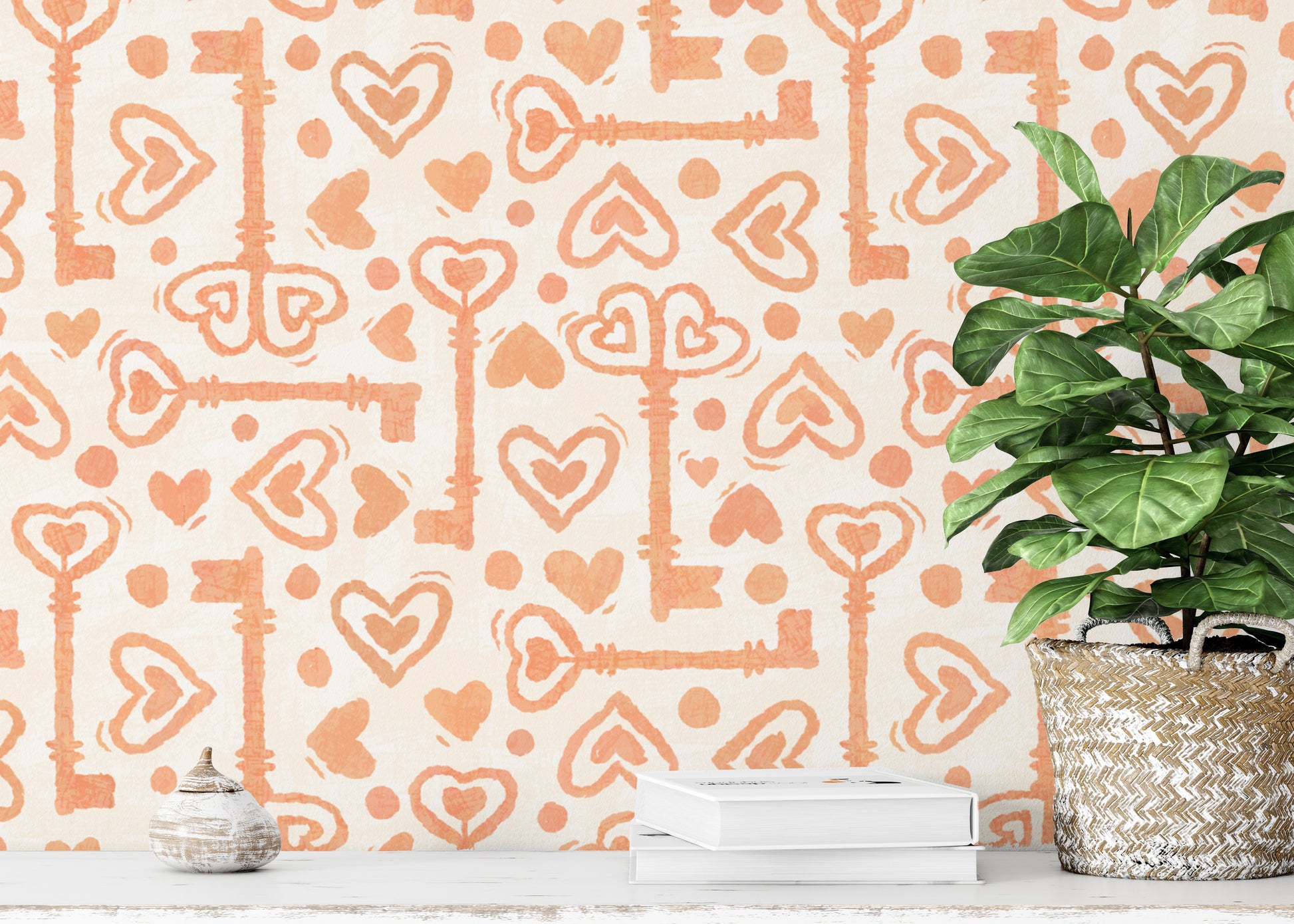 Peach-toned wallpaper with hearts and keys