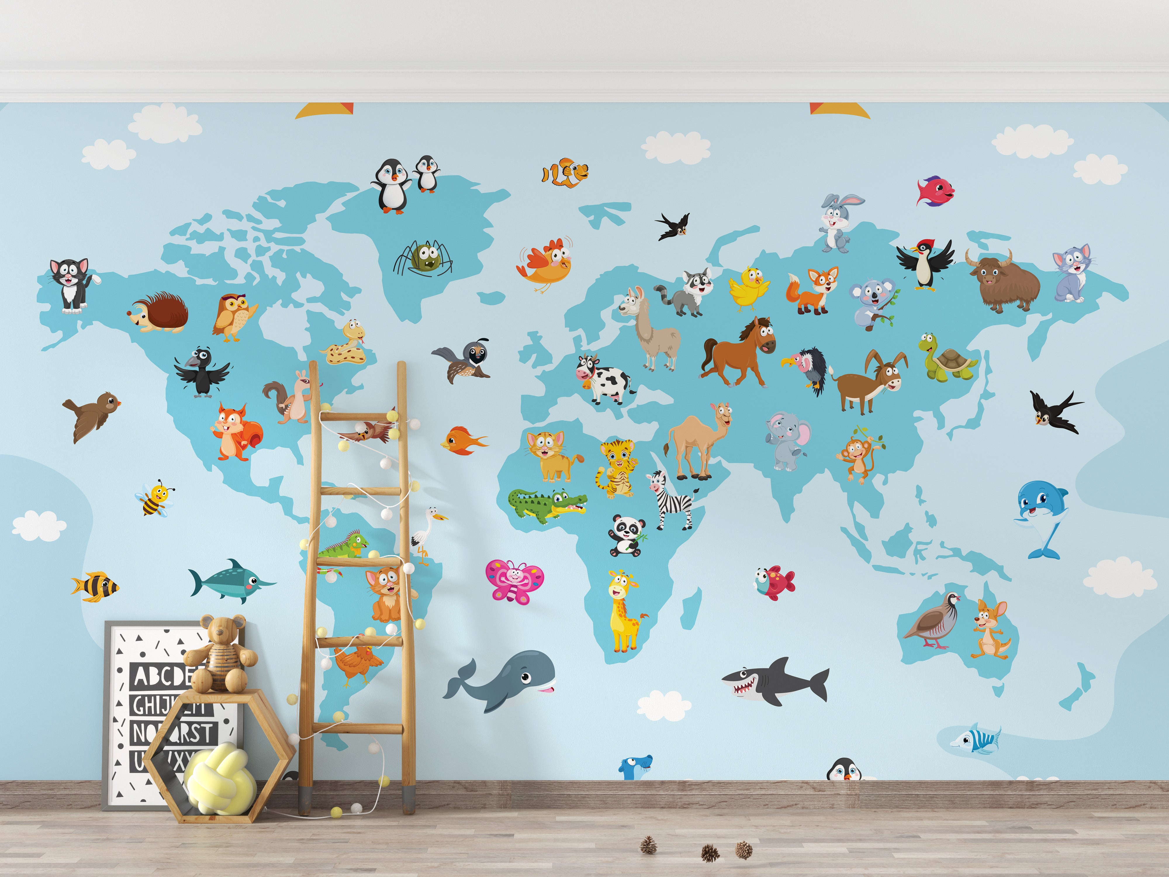 Check out the cool kids animal world map wallpaper. This map wallpaper for kids is both fun and educational. It takes little explorers on a trip around the world, visiting brightly colored countries and meeting cartoon animals that live there. There is a different animal for each area, which makes it fun for kids to learn about geography and wildlife at the same time. The bright colors and fun patterns on the cartoon animal map wallpaper make it a great addition to any child's room or play area. It makes you curious and makes you want to learn and discover new things. It's a great mix of teaching and decoration, made with quality and durability in mind. With this beautiful animal world map wallpaper for kids' rooms, you can dive into a world full of surprises.