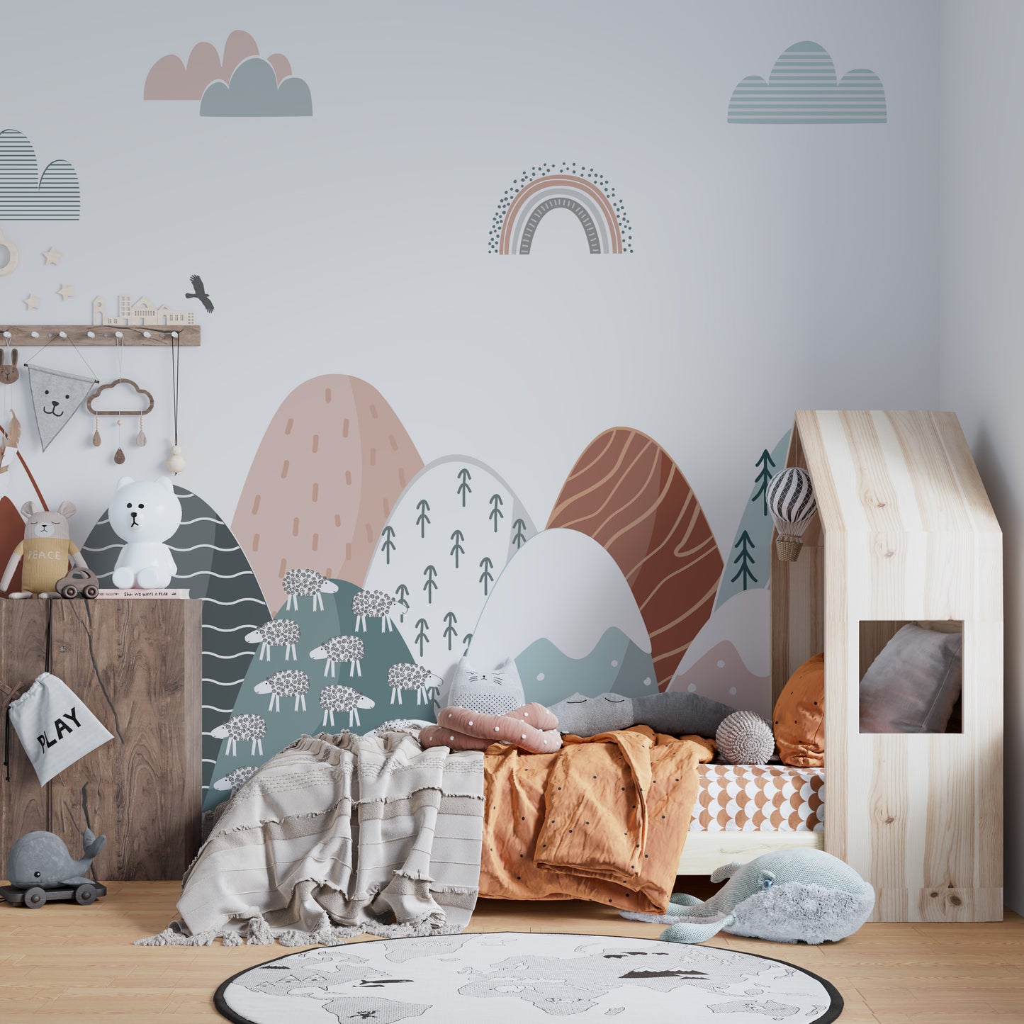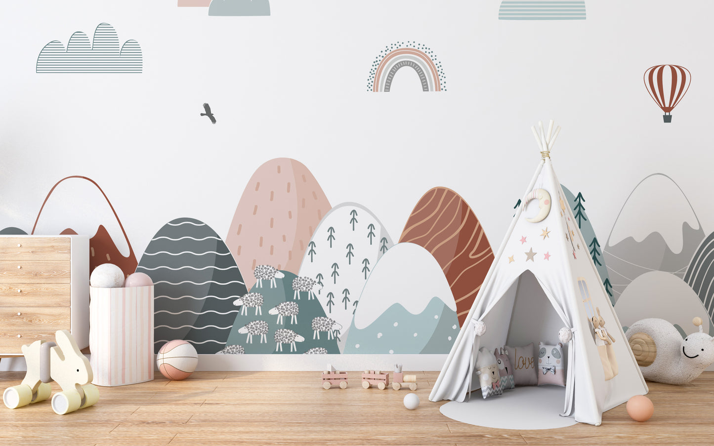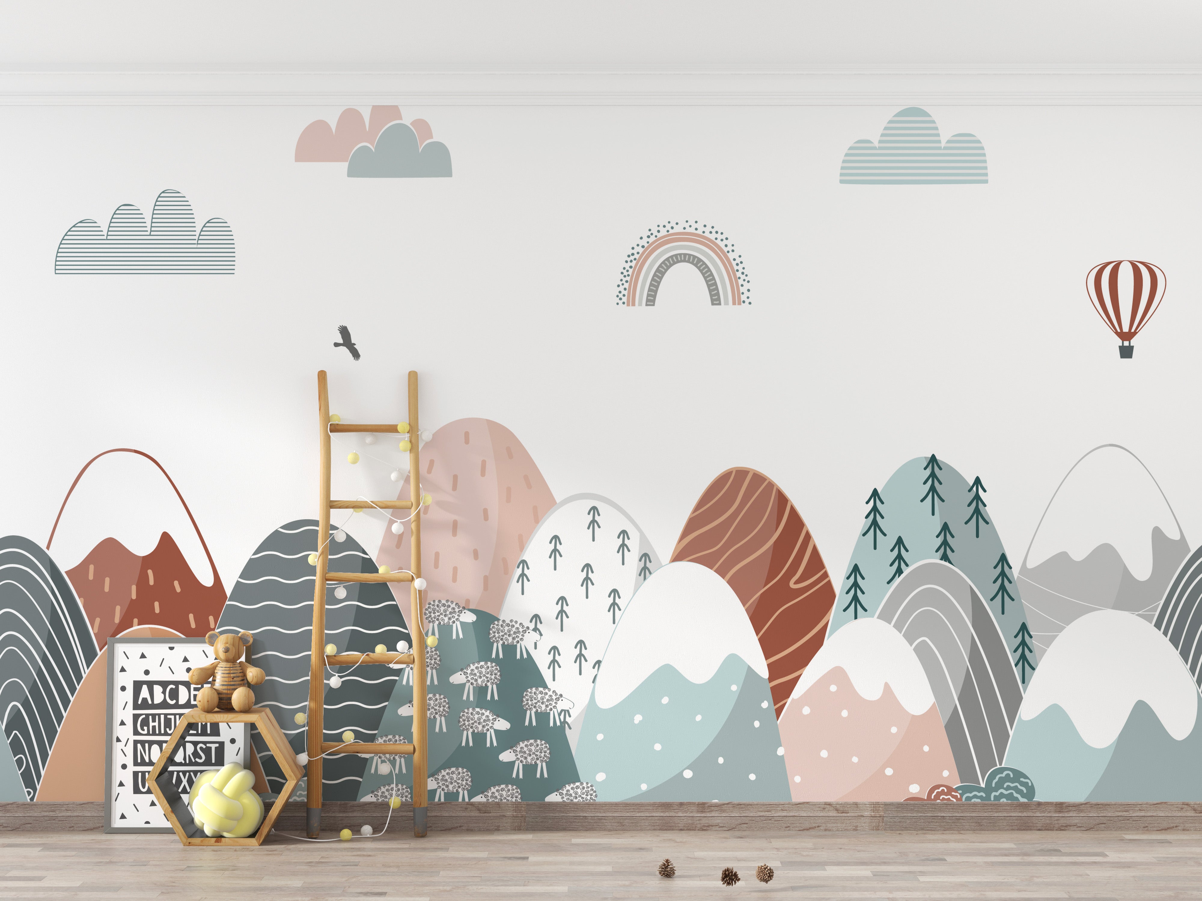 The Scandinavian influence is evident in the clean lines and simple forms of the mountains, giving the wallpaper a modern, minimalist charm that complements any room decor. This colourful wallpaper is more than mere adornment, it's a catalyst for adventure and storytelling, inspiring young minds to explore and dream.