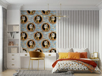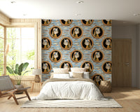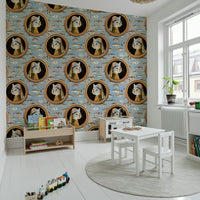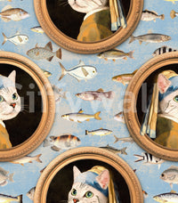 Introduce a hint of quirkiness with this artistic wallpaper by Uta Naumann. Golden-framed cat portraits inspired by the famous Vermeer painting contrast with a bright blue ocean-inspired background. Many different types of fish float about the cat's heads, filling in all of the background. This unique wallpaper for walls is perfect for those who want to add an element of wit to your interiors. Its unique design serves as an excellent conversation starter, bringing sophistication to hallways, bedrooms, or even an office. The blend of the classic and the quirky guarantees an unforgettable interior design.
