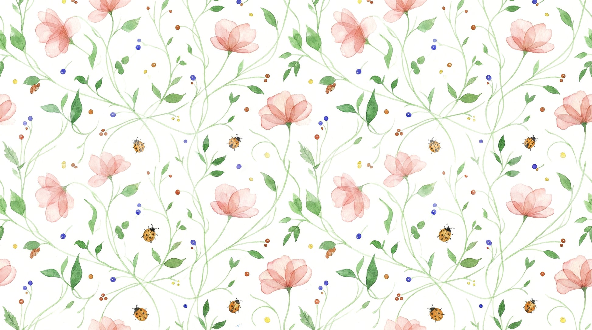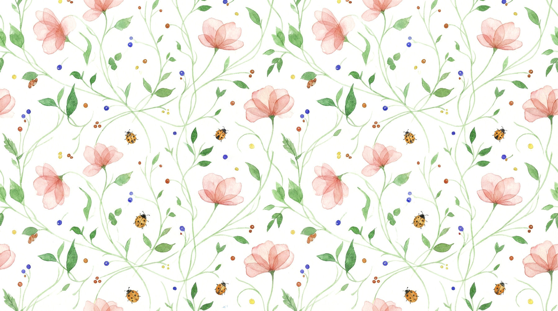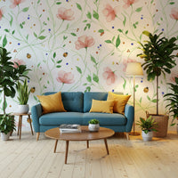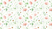 Introduce a touch of springtime charm to your interiors with this artistic floral wallpaper. Soft pink blossoms intertwine with green vines and cheerful ladybugs against a clean white backdrop. Perfect for adding a subtle pop of colour and whimsy to any space, this wallpaper for walls creates a refreshing atmosphere in bedrooms, nurseries, or even hallways. The watercolour aesthetic brings a hand-painted feel that complements both modern and traditional décor. Consider how this pattern introduces elegance and serenity to your walls.