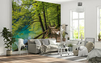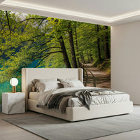 Bring the calmness of a secluded lakeside retreat into your home with this soothing wallpaper for walls. The image captures a sun-dappled trail edged by vibrant green foliage, running parallel to a pristine lake. The colour palette focuses on cool aquas and warm earth tones, which evokes a sense of tranquility. Perfect for a bedroom, spa, or meditation room, this design adds depth and creates a restful environment. Let the wallpaper immerse your interior space into a place of serenity and natural beauty.