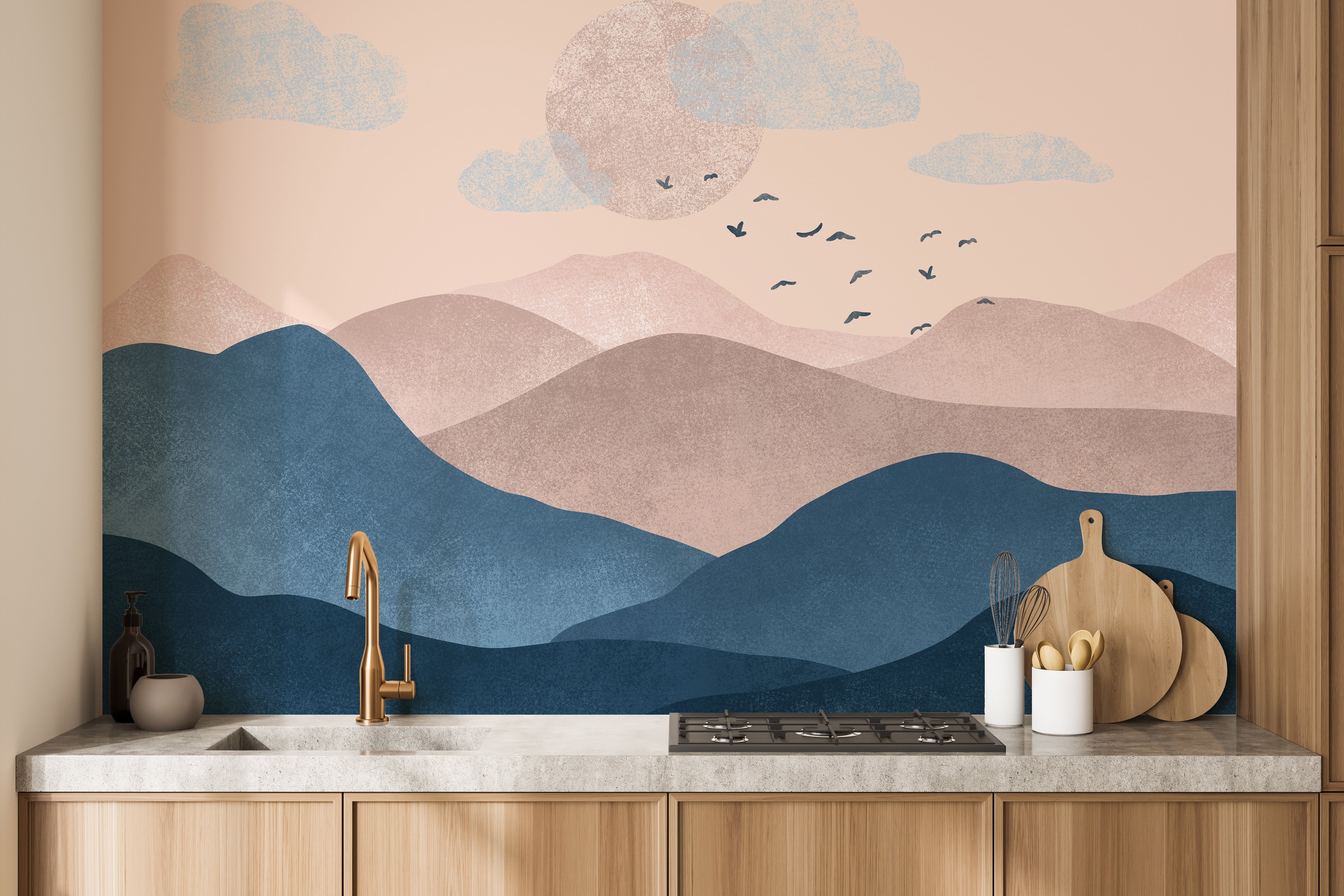 Landscape Blue Pink Mountain Stick on Wallpaper