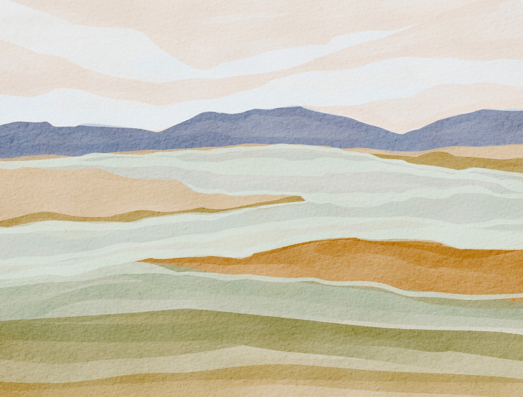 This wallpaper evokes a sense of tranquility with its soft, muted color palette and abstract landscape design. The gentle curves and layering of earthy tones—from pale beige and sage green to muted blues and browns—create a calming and peaceful atmosphere. The minimalist style allows for versatile placement in any room, offering a subtle yet sophisticated touch to your home decor. The slightly textured appearance adds depth and visual interest without being overwhelming, making it ideal for creating a serene and restorative space.