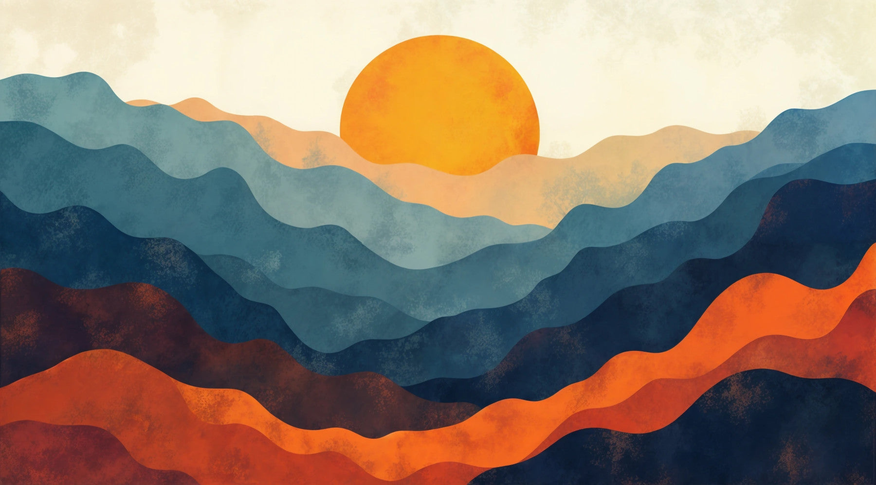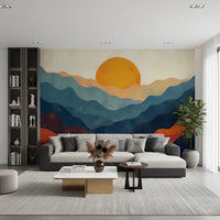 Create a soothing focal point in your home with this artistic layered horizon wallpaper for walls. Abstract mountain ranges, rendered in watercolour-style blues, oranges, and browns, overlap to create depth and visual interest. A warm, sun-like orb sits at the horizon, providing a sense of calm and inviting you to bask in the beauty. This design works well in bedrooms, living rooms, or even hallways, bringing a unique and calming element to your decor. The brushstroke texture adds to the artistic feel and adds warmth to the room. Install this landscape to give any space a sophisticated and peaceful ambiance.