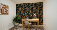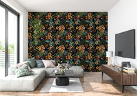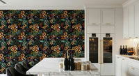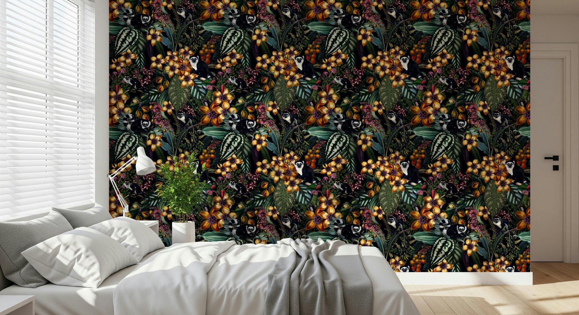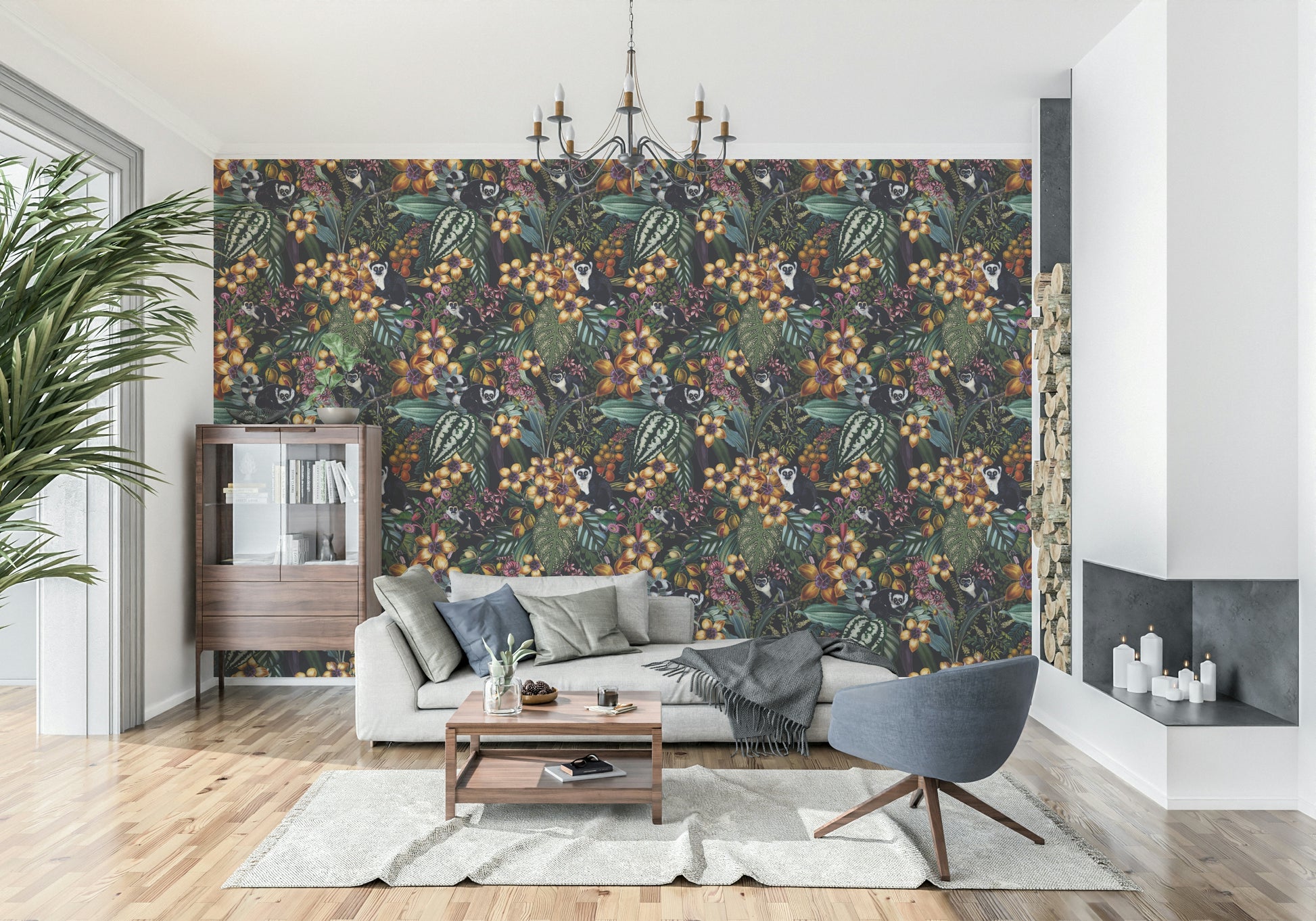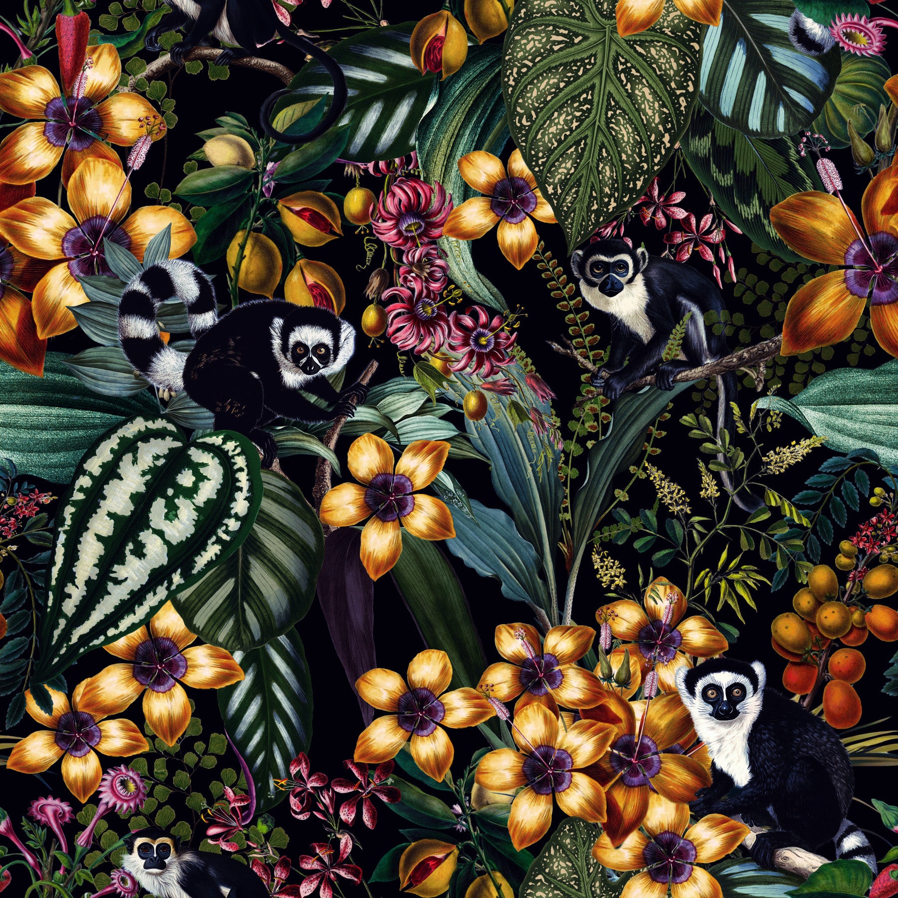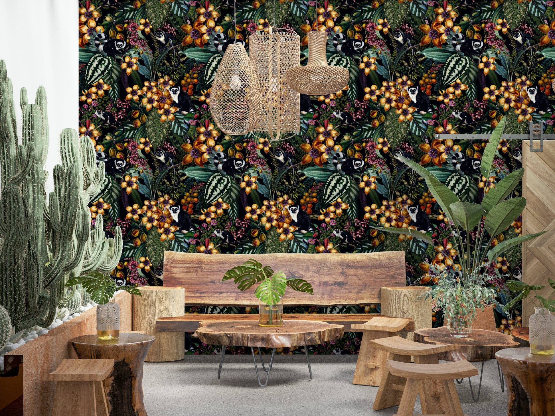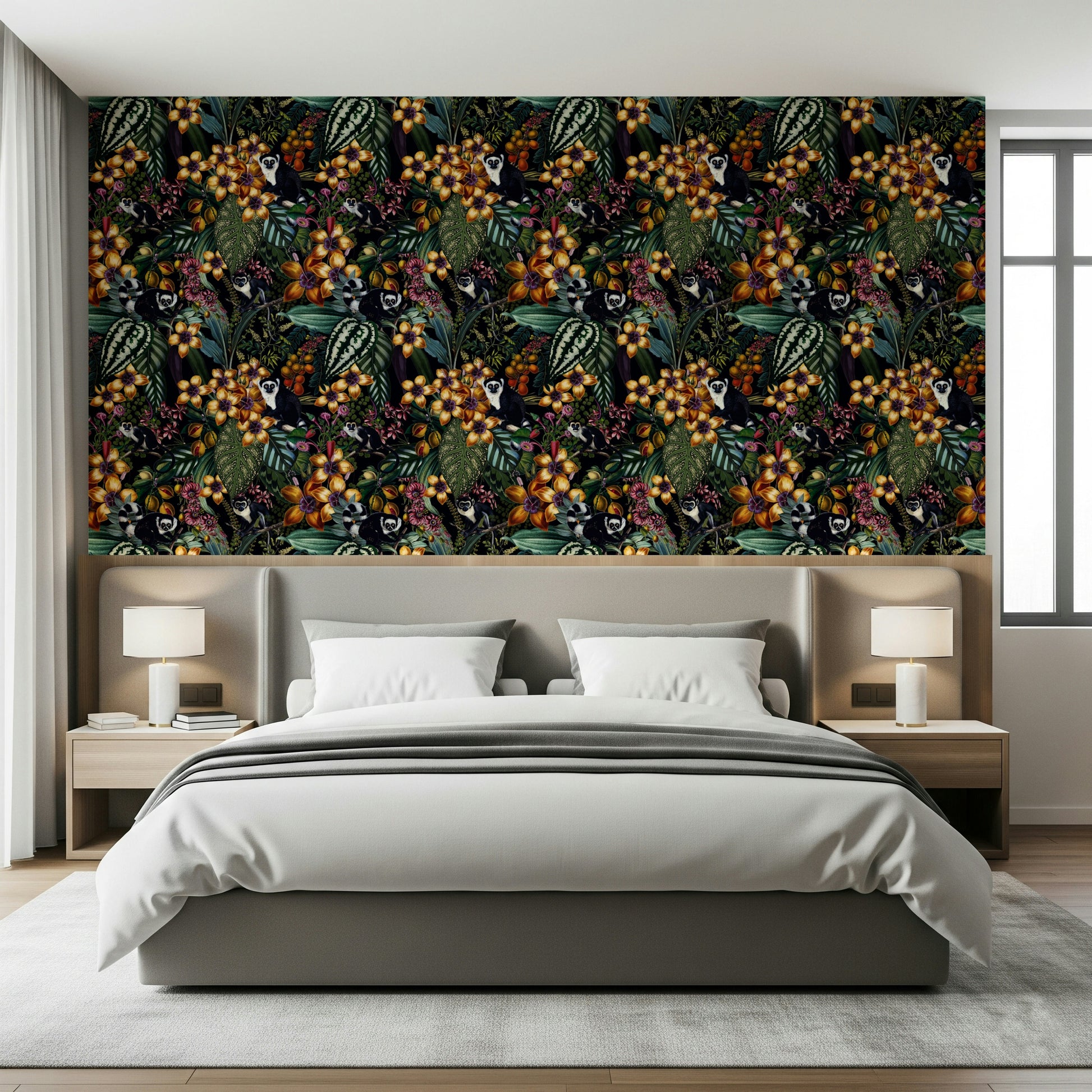 Unveil the enchanting world of 'Lemur's Secret Garden,' a vibrant wallpaper design bursting with exotic beauty. Rich, dark tones set the stage for a profusion of luminous yellow flowers and deep green tropical leaves, creating a luxurious and mysterious atmosphere. Playful lemurs are artfully nestled amongst the blossoms, adding a touch of playful charm to this sophisticated design. The intricate detail of the botanical illustrations invites close inspection, revealing a hidden world of wonder and tranquillity. This wallpaper is ideal for adding a touch of opulent elegance and captivating nature to any space.
