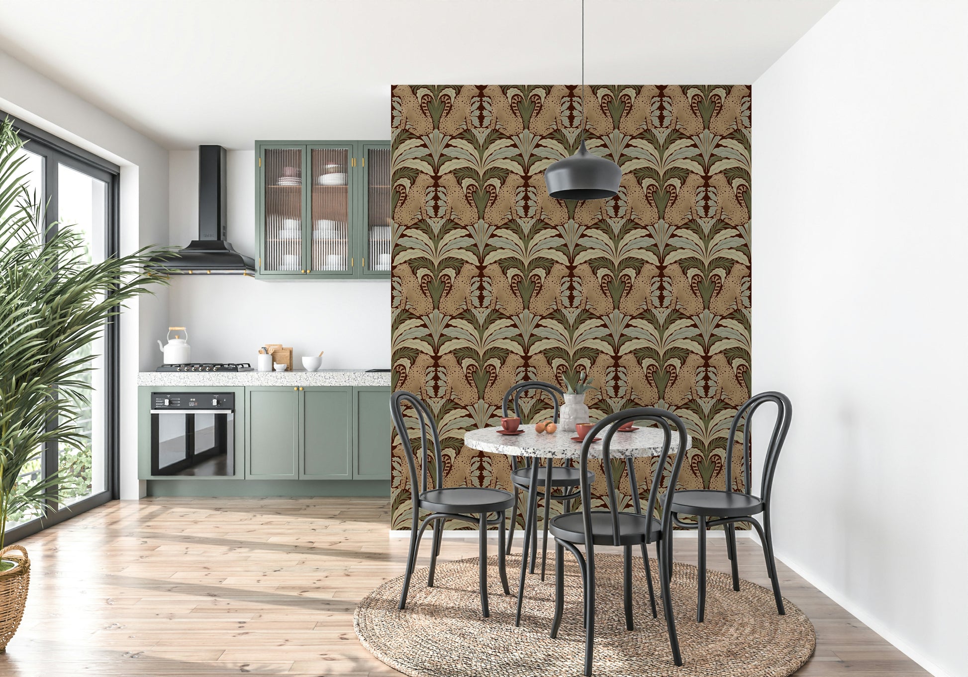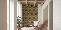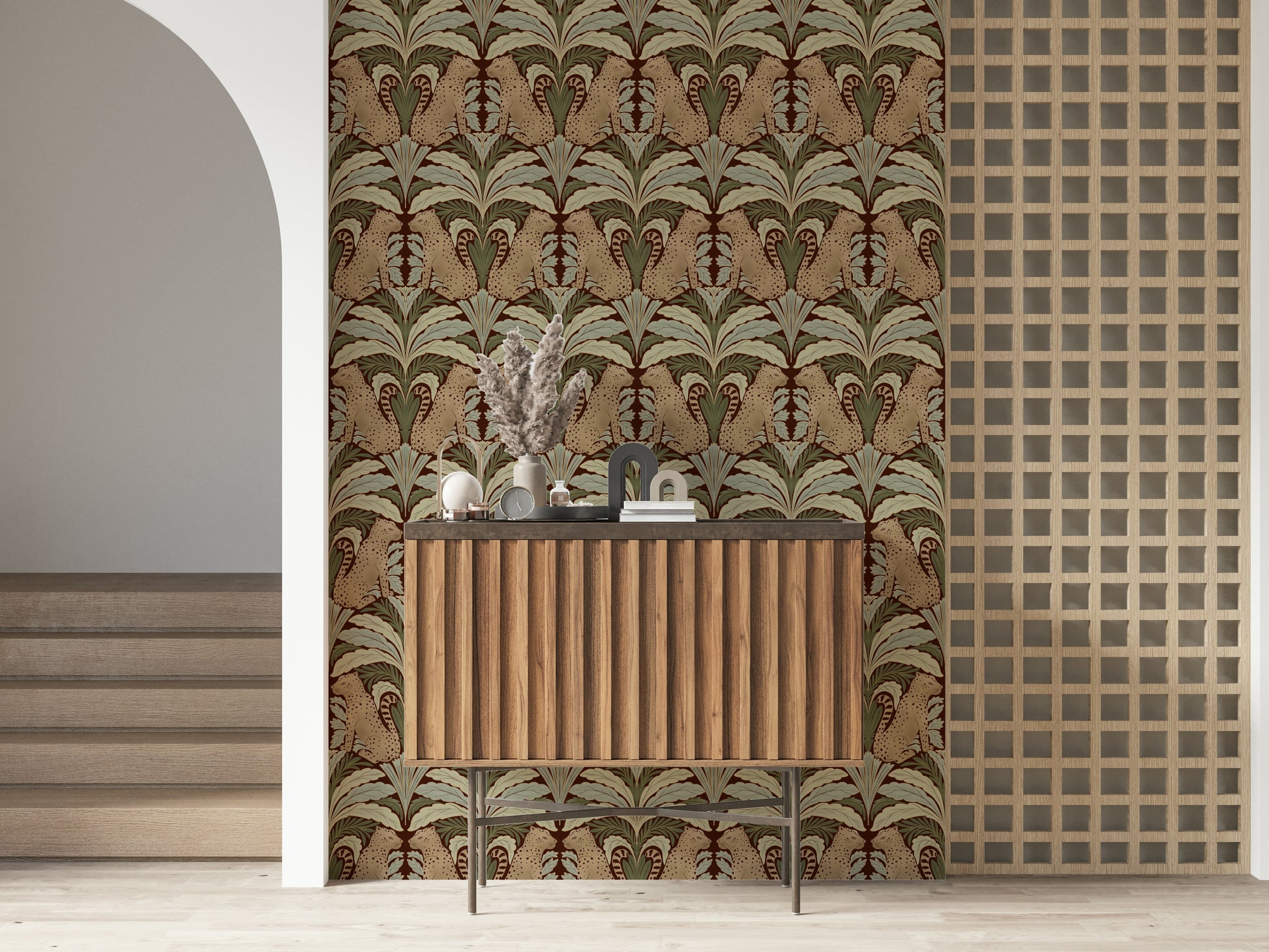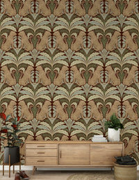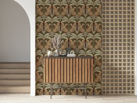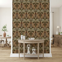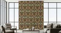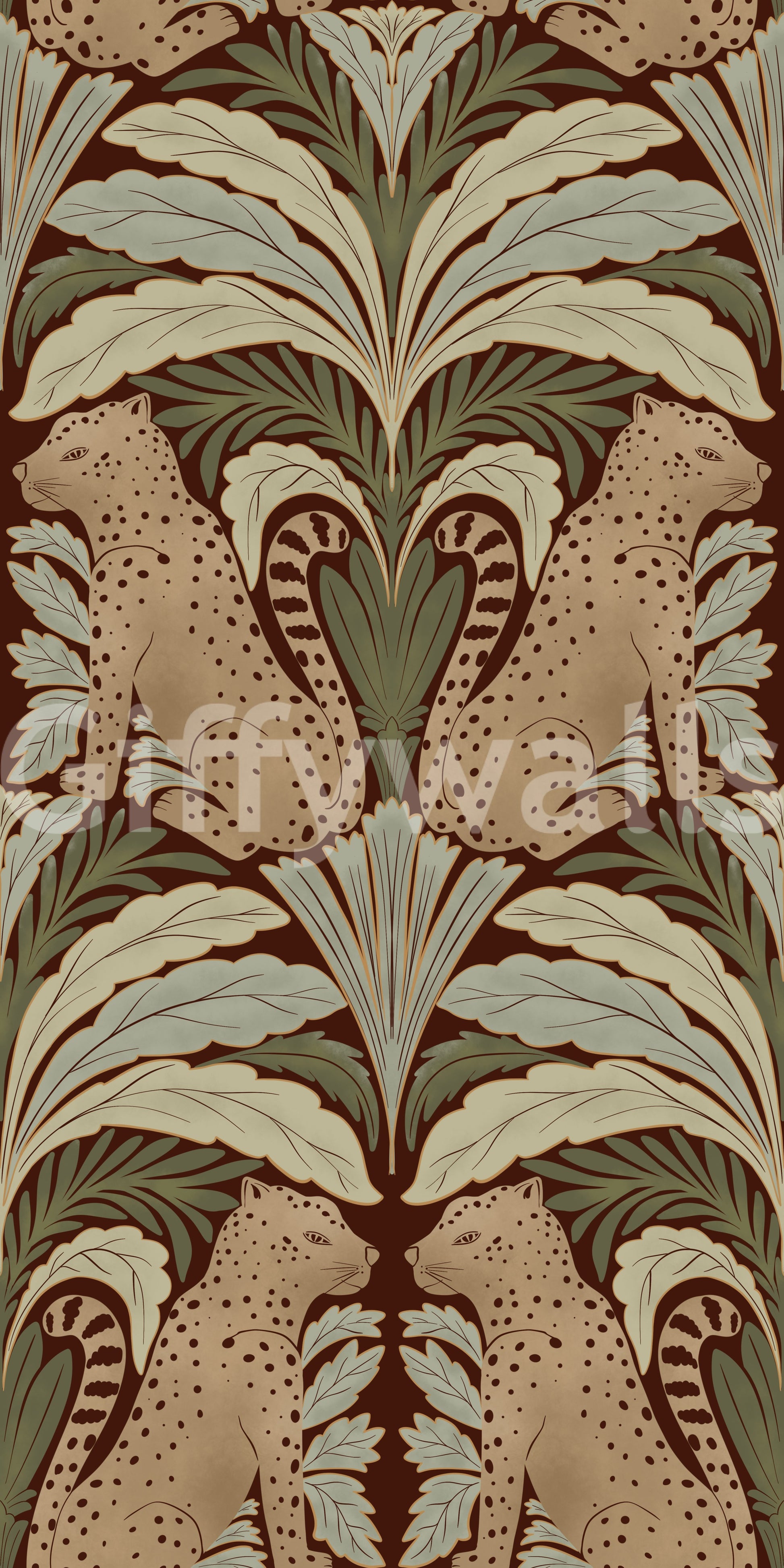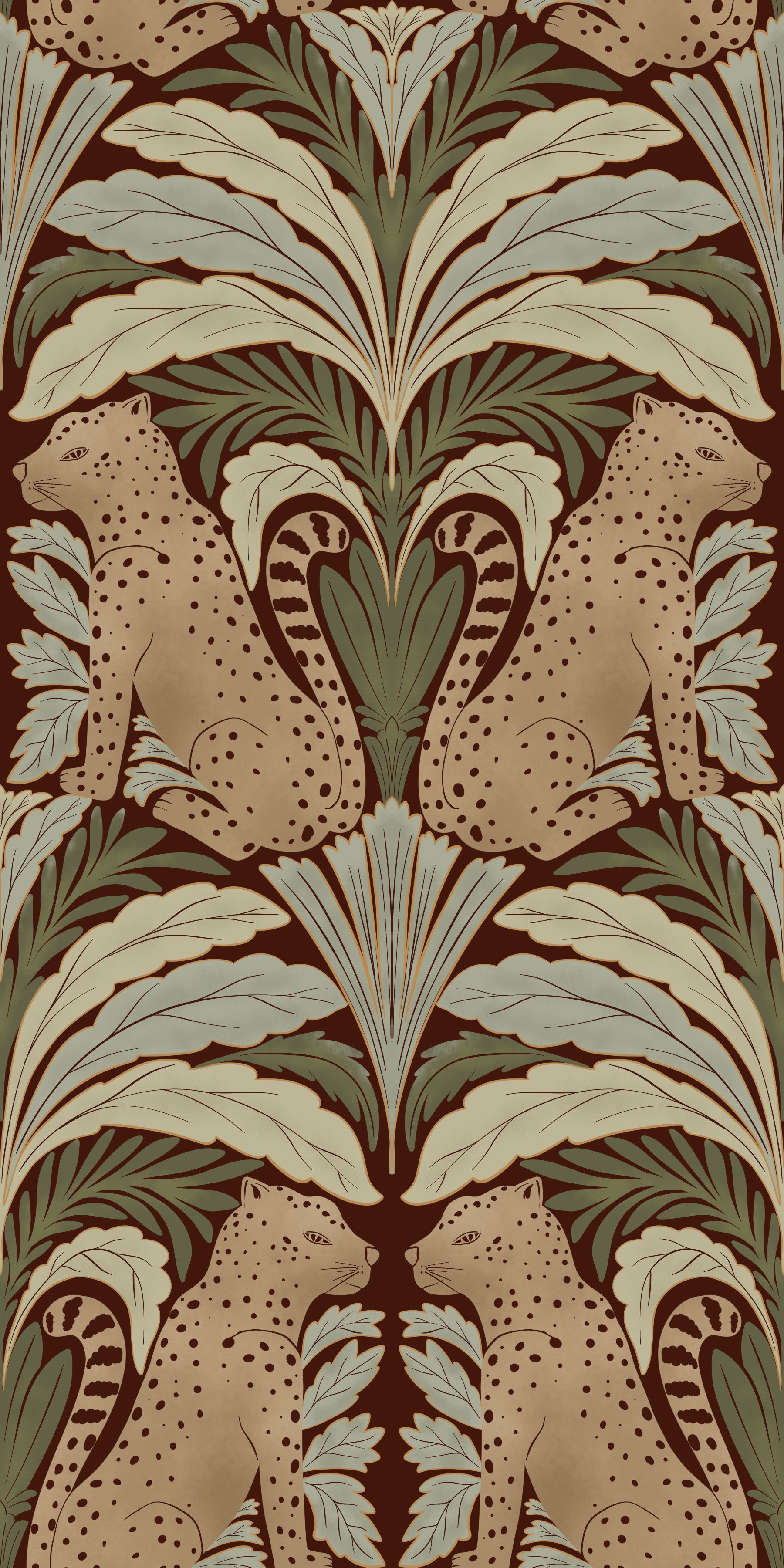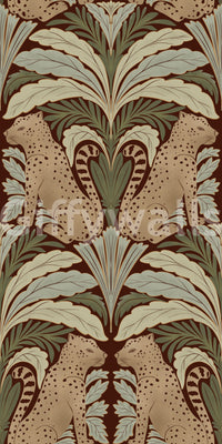 Immerse yourself in the tranquil charm of 'Leopard's Eden,' a meticulously crafted wallpaper that blends wild beauty with botanical grace. Set against a deep, earthy background, stylized leopards gaze serenely amidst symmetrical arrangements of stylized leaves in shades of sage and muted greens. The repeating pattern creates a soothing, timeless aesthetic, perfect for adding a touch of exotic elegance to any space, from a sophisticated living room to a calming bedroom retreat. The design's balanced composition and earthy colour palette ensure a harmonious and inviting atmosphere.