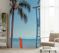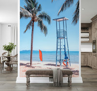 Capture the beauty of a tropical beach with this soothing wallpaper for walls. The design showcases a lifeguard tower against a backdrop of clear blue skies and gentle waves. Palm trees frame the scene, adding to the overall sense of relaxation. The wallpaper's soft colour palette enhances any interior, making it ideal for bedrooms or bathrooms. Its tranquil ocean view transports you to a serene coastal escape, complementing the interior with its breezy and calm character. Enjoy a peaceful vibe.