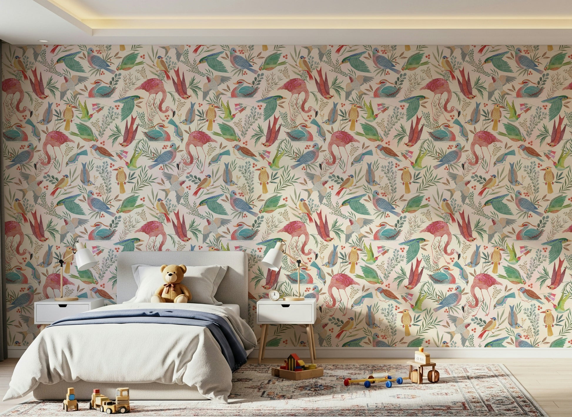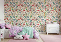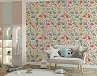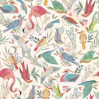 Embrace the serenity of 'light Birdwatcher's,' a whimsical wallpaper featuring a vibrant collection of stylised birds amidst delicate foliage. Soft watercolour textures and a calming cream background create a peaceful atmosphere. Flamingos, hummingbirds, and a variety of other avian species are depicted in a charming, almost fairytale-like style. The intricate details and pastel colour palette make this wallpaper ideal for adding a touch of nature-inspired elegance to any digital device. This design is perfect for those seeking a lighthearted yet sophisticated aesthetic.
