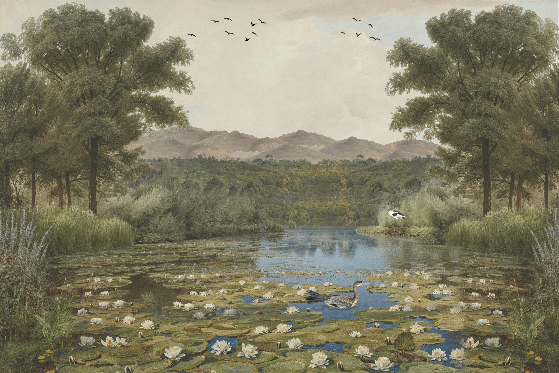 This exquisite wallpaper transforms any interior into a peaceful natural sanctuary. It showcases a serene lily pond, teeming with white water lilies and graced by elegant water birds. Lush green trees frame the scene, leading the eye towards distant, rolling hills under a soft, muted sky. The artwork's classical illustration style, with its detailed brushstrokes, and an earthy colour palette of deep greens, tranquil blues, and warm beiges, creates a uniquely calming atmosphere. Ideal for a living room, bedroom, or study, this design effortlessly enhances the room's depth and brings a timeless, contemplative beauty. Its rich detail and harmonious composition invite quiet reflection, fostering a serene escape within your home. This pastoral vista complements both traditional and modern decor, establishing a focal point of organic elegance.