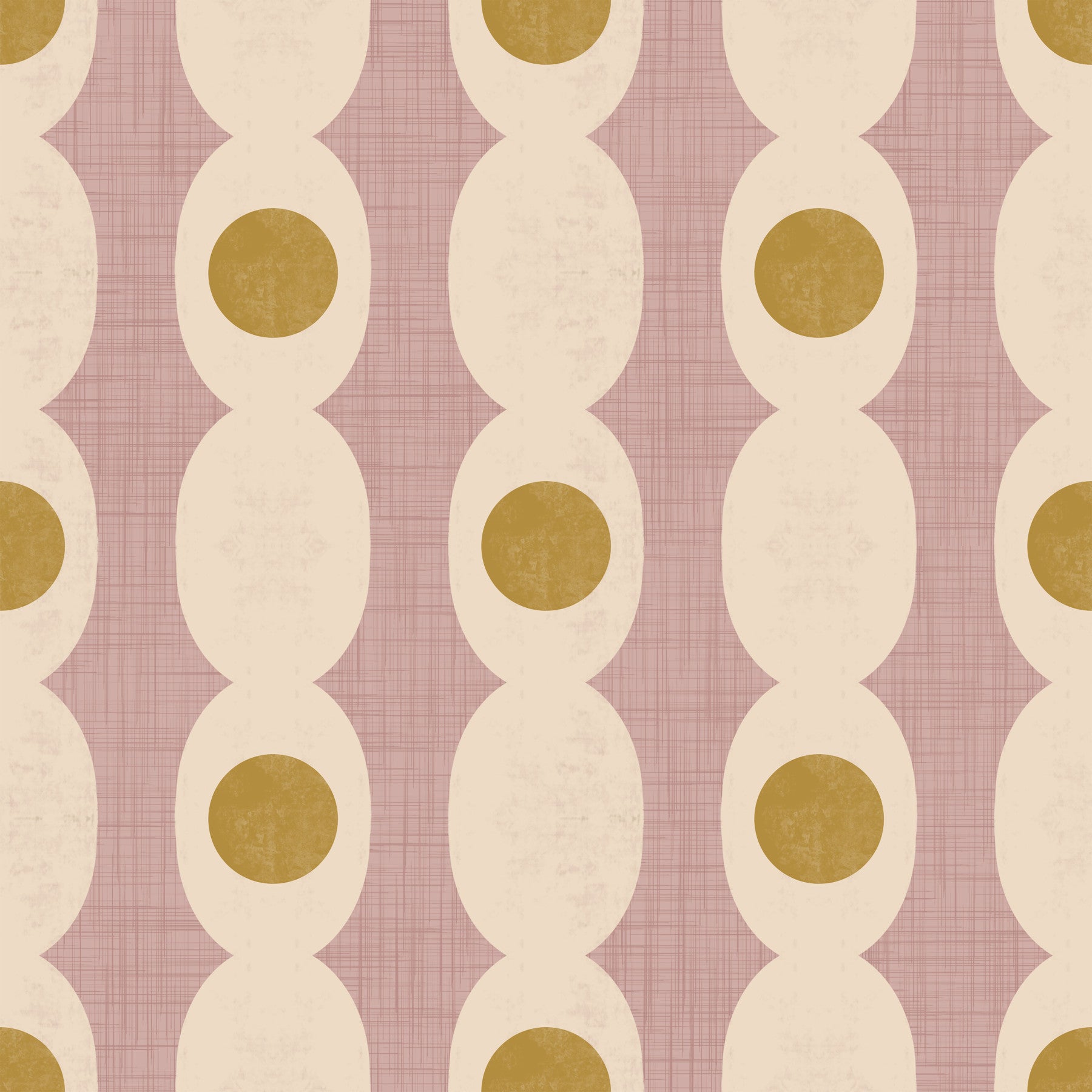 This captivating wallpaper features a pattern of interlinked geometric shapes, combining circles and ovals in a stylish, repeat design. A muted colour scheme of beige, gold, and mauve provides a warm, inviting feel. The simple yet striking pattern brings a modern touch to bedrooms, hallways, and living areas. Installation is easy, instantly boosting your home decor. The versatile style of this wallpaper for walls makes it ideal for both contemporary and mid-century modern spaces.