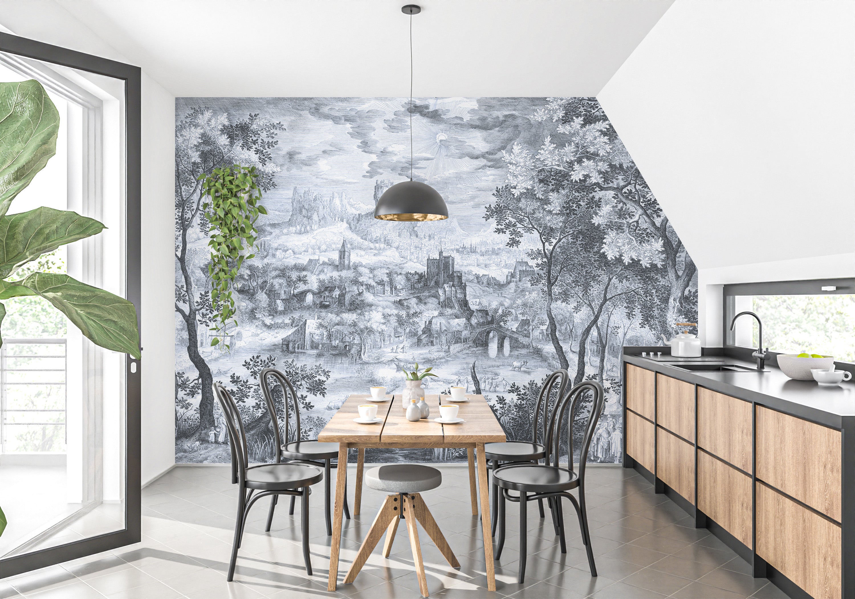Monochrome mural wallpaper of a village view