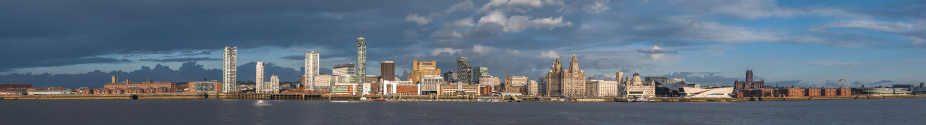 Liverpool city skyline across the River Mersey, UK. Capture the charm of Liverpool with this expansive cityscape wallpaper. The panoramic design showcases iconic buildings against a dramatic sky, merging historical architecture with modern urban flair. The water reflects the city lights, adding depth and serenity. Hues of blue, brown, and beige create a calm yet impactful statement. Transform your living room, office, or hallway with this scene. Perfect wallpaper for walls if you look to enhance interiors with sophisticated style and a touch of worldliness.