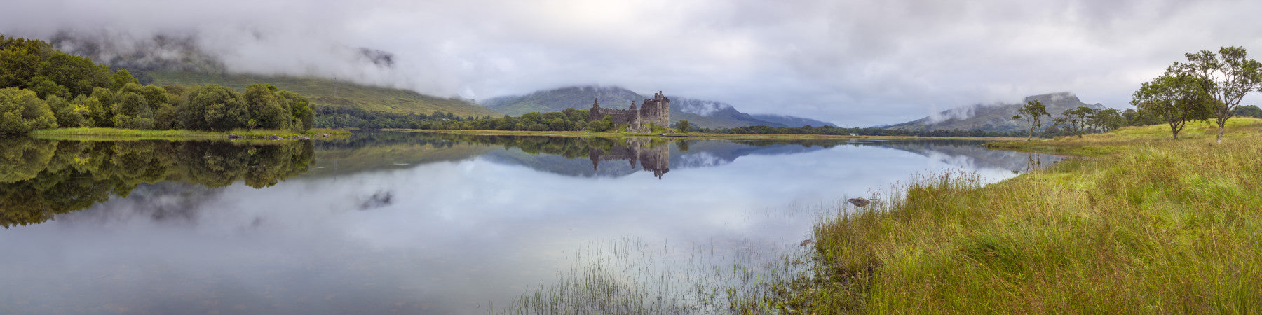 Kilchurn Castle, Loch Awe, Scotland. Transform your interior with the tranquil beauty of the Scottish Highlands through this refined wallpaper for walls. A calm loch perfectly mirrors a historic castle amidst a misty, mountainous landscape. The soothing palette of greens, blues and greys brings a sense of peace and expansiveness to any room. It suits living rooms, bedrooms and home offices, adding sophistication and visual interest. The design is versatile, complementing both modern and rustic interiors.