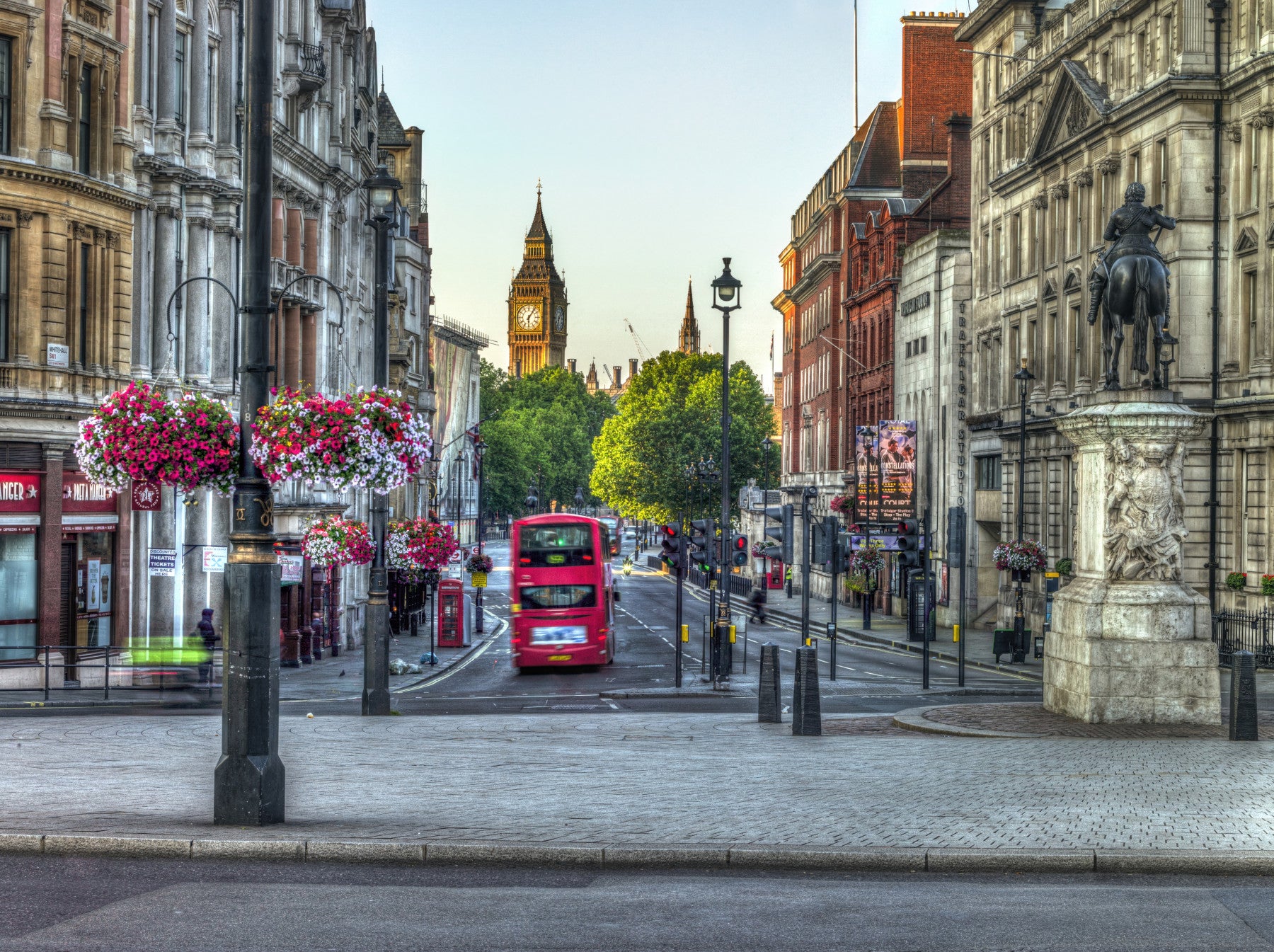 Bring the iconic streets of London into your space. This wallpaper for walls captures the heart of the city with its classic architecture, vibrant red double-decker bus, and charming flower displays. The blend of urban landscape and natural touches creates a sophisticated atmosphere. It is ideal for living rooms, hallways, or home offices, injecting a sense of travel and timeless elegance. The design complements interiors with its balanced composition and soft colour palette.