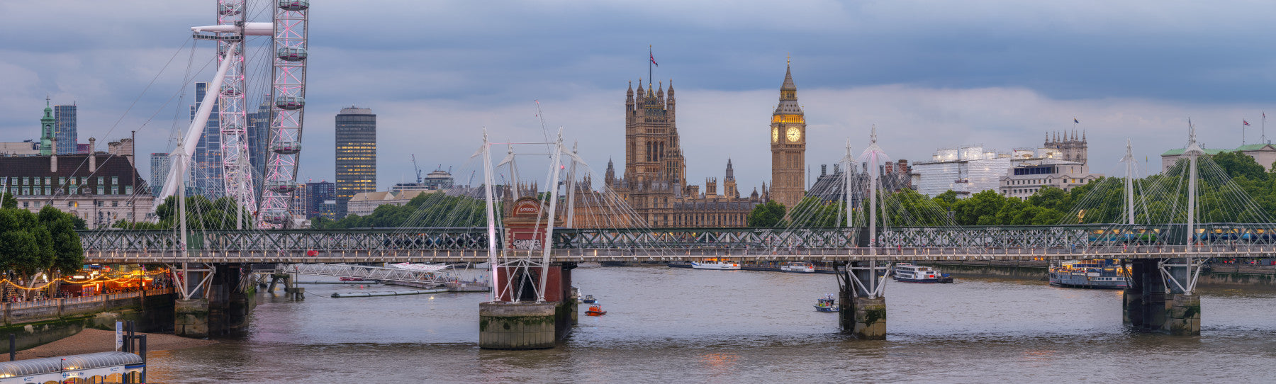 Experience London's charm with this wallpaper for walls, showcasing iconic landmarks at dusk. The image captures the London Eye, Houses of Parliament, and Hungerford Bridge reflecting on the River Thames. Soft lighting illuminates the scene, creating a calming ambiance perfect for living rooms or offices. The design complements interiors with its classic architecture and serene river view, bringing a touch of British elegance to any space. The muted color palette provides a sophisticated backdrop.