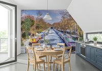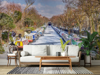 Experience the enchanting beauty of London's canals in winter with this captivating wallpaper. The image showcases a picturesque stretch of waterway draped in a pristine layer of snow. A collection of charmingly colourful houseboats are moored along the banks, adding pops of bright colour against the white landscape. Bare trees, dusted with snow, frame the scene, leading the eye towards a distant tunnel. The partially frozen canal adds a touch of winter magic, creating a serene and peaceful ambiance. Perfect for anyone who appreciates the unique charm of London and the beauty of winter.
