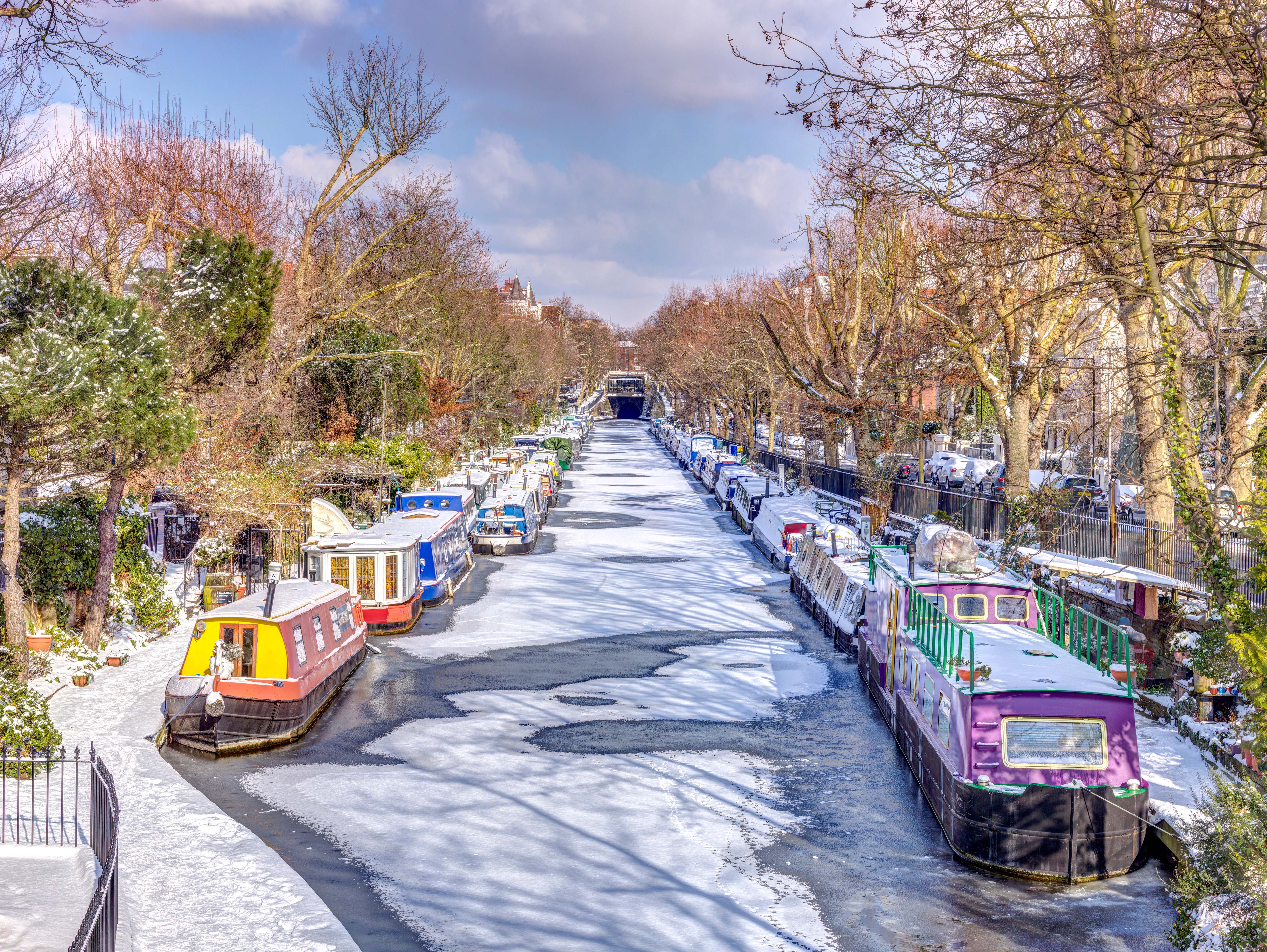 London winter waterways mural for bedroom feature wall, soft grey and blue
