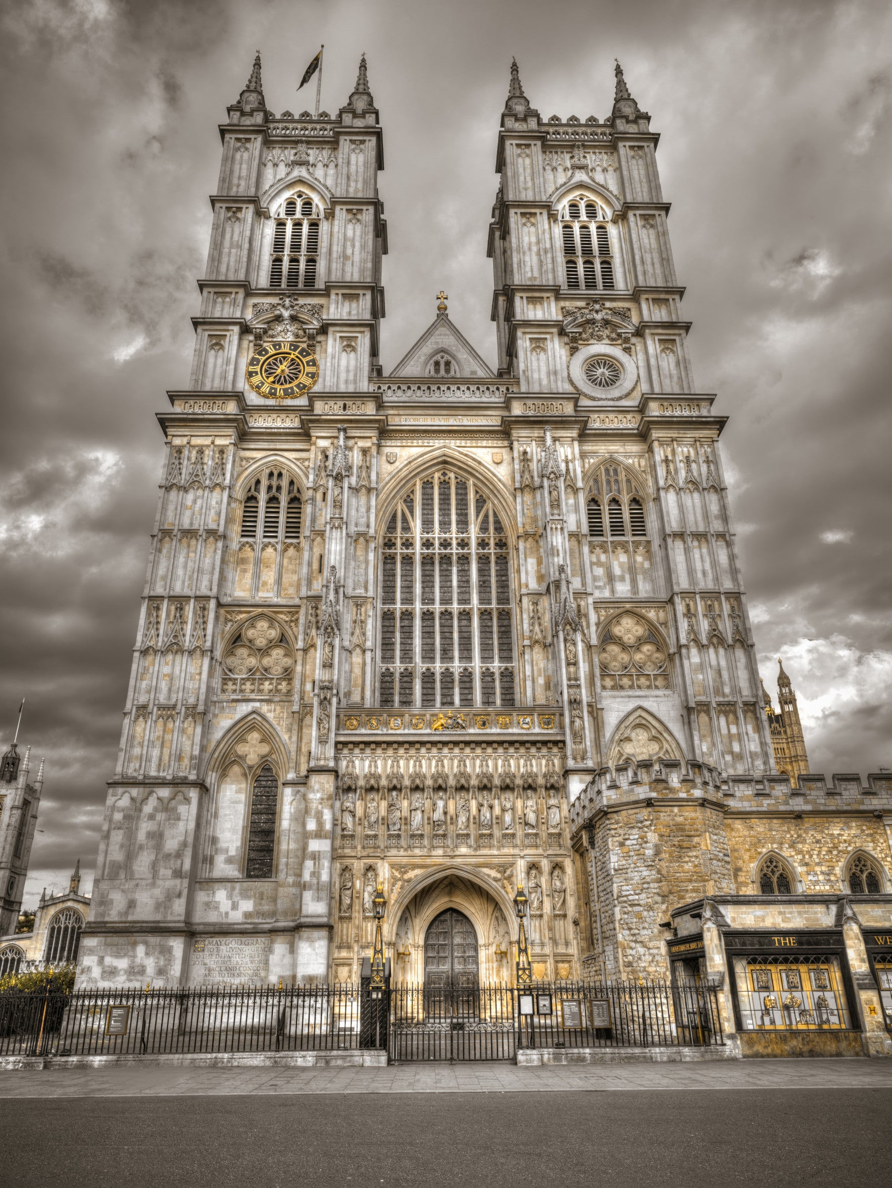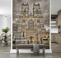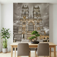 Famous Westminster Abbey in London, UK. Transform your walls with the grandeur of Westminster Abbey. This architectural wallpaper for walls showcases intricate Gothic details and a muted colour palette, bringing historic charm to any room. Gold accents highlight the building's ornate features, adding a touch of regal elegance. Install it in a living room to create a sophisticated statement or in a home office for a distinguished atmosphere. The design complements classic and contemporary interiors, providing depth and visual interest. Experience the allure of London's iconic landmark every day.