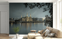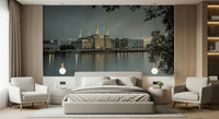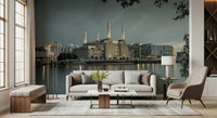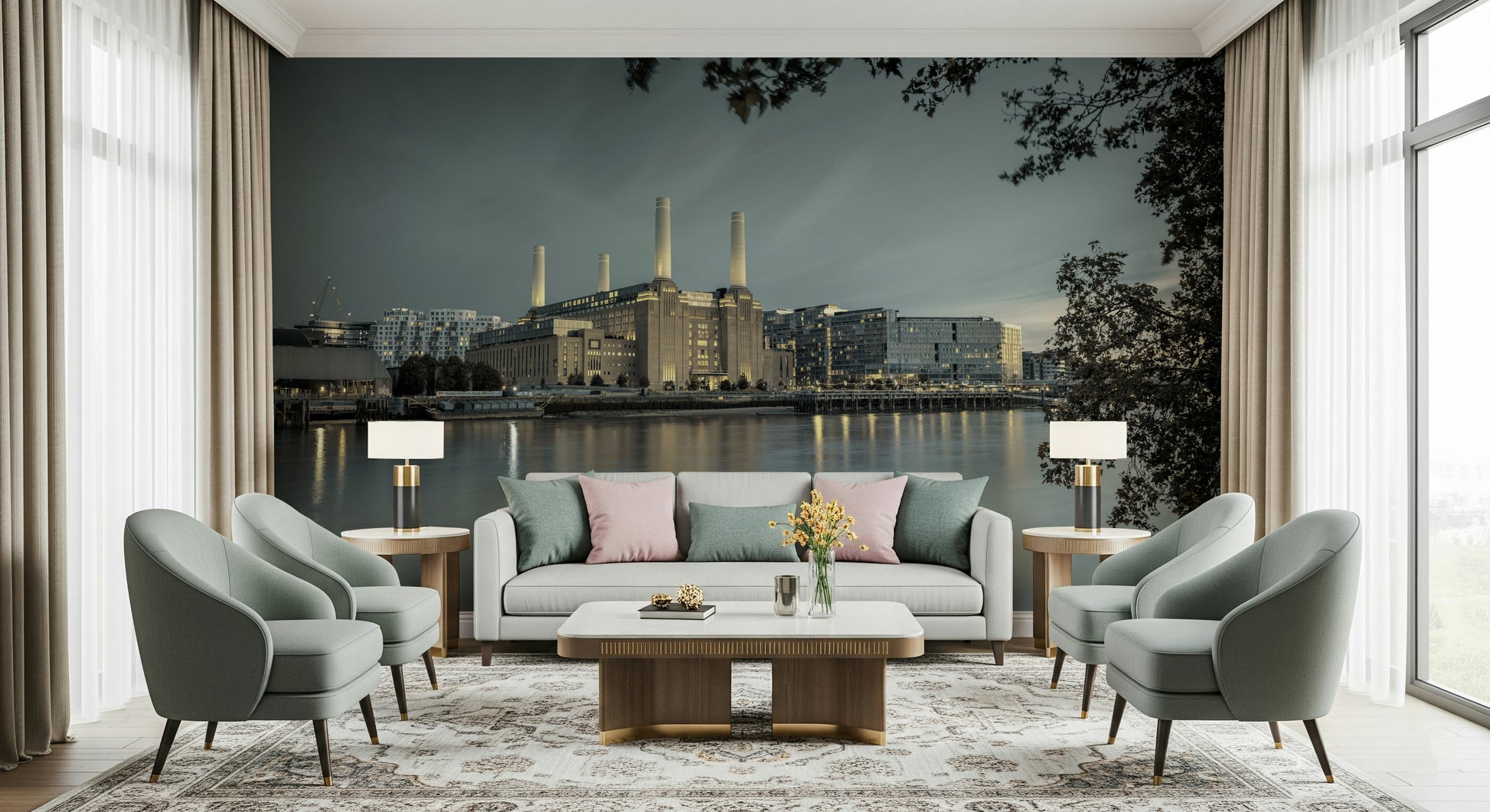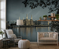 Battersea Power Station, London. Bring the quiet beauty of a city at twilight into your home. The soft colours and mirrored reflections create a soothing and visually interesting scene. This serene cityscape makes stunning wallpaper for walls in bedrooms, living rooms, or home offices. The muted palette easily integrates with various design schemes. This image lends itself to a modern or minimalist style. Enliven your space with an atmosphere of peaceful urbanity. The water's gentle movement and the skyline's subtle light evoke a feeling of calm.