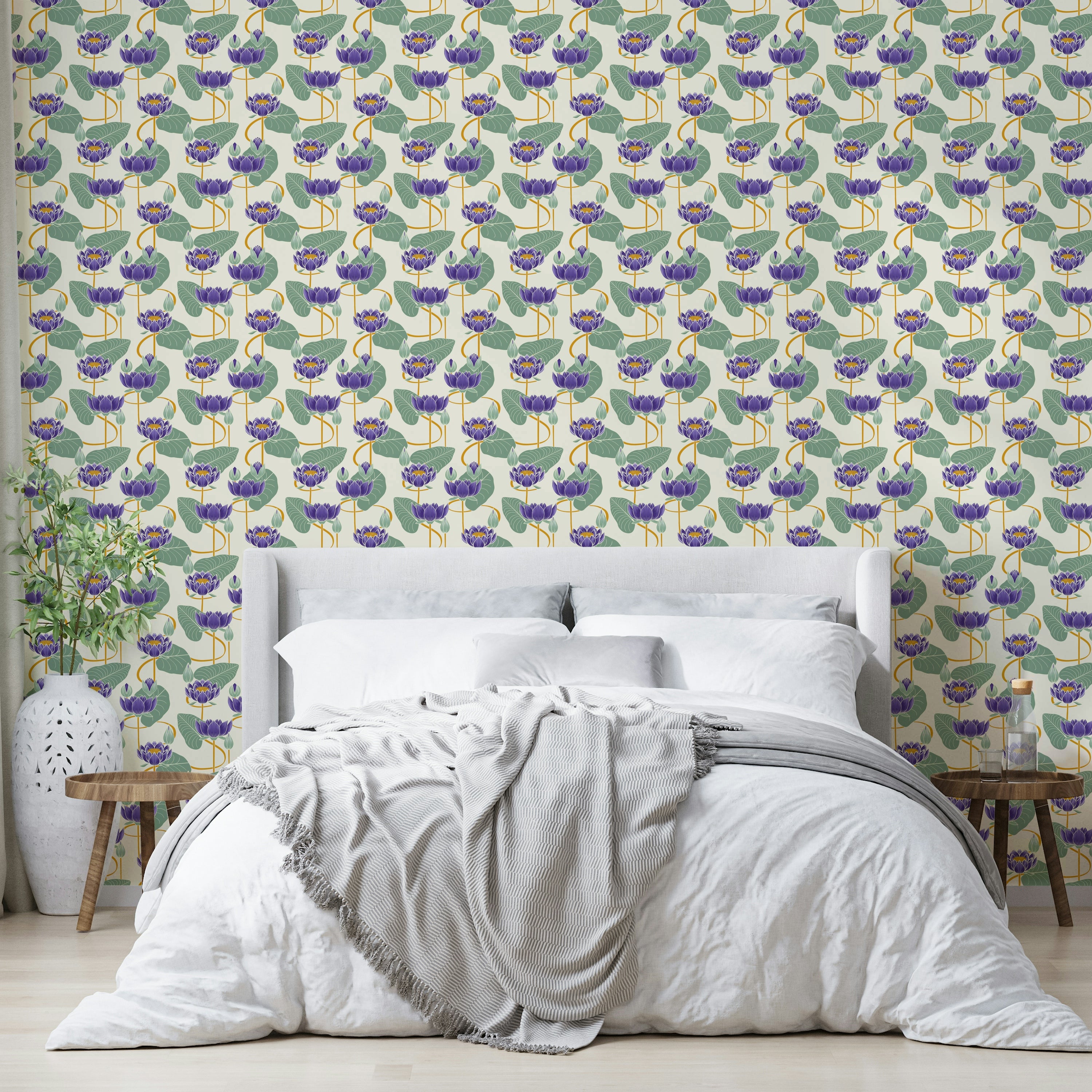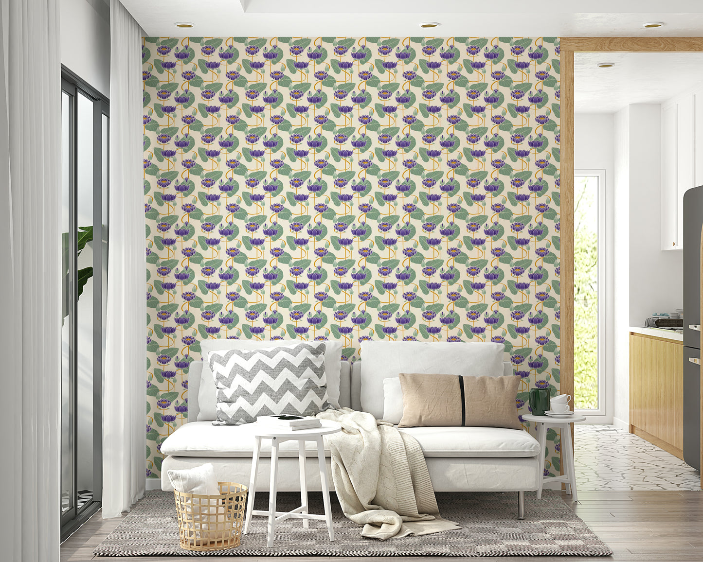 Add a bold touch to your interiors with Lotus Reverie wallpaper. This design features deep purple lotus blooms paired with soft green leaves and golden stems, all placed over a warm cream base. The contrast of rich and muted tones creates an eye-catching look that balances elegance and freshness. Ideal for bedrooms, living rooms, or meditation areas, this wallpaper for walls brings in a mix of modern style and traditional floral art. The symmetrical layout and detailed textures make it perfect for those who enjoy statement pieces in their wall design while keeping a refined and grounded aesthetic.