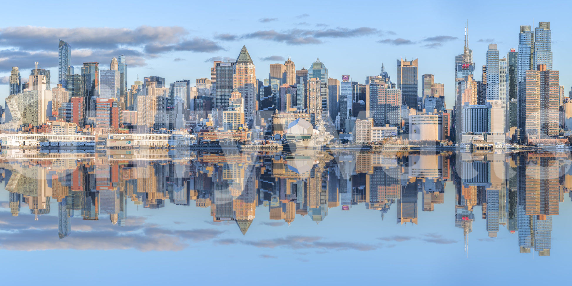 Panoramic view of Lower Manhattan skyline, New York. Immerse yourself in the heart of New York City with this stunning wallpaper showcasing the iconic Lower Manhattan skyline. The image captures the architectural grandeur of the city, with its towering skyscrapers bathed in the warm, soft glow of early morning or late afternoon light. The scene is incredibly still and peaceful, featuring a perfect reflection of the buildings shimmering on the calm waters below, creating a mirrored world that doubles the visual impact. The colour palette is a blend of cool blues and warm oranges, offering a balanced and calming aesthetic. This image encapsulates the vibrant energy and serene beauty of Lower Manhattan, making it an ideal backdrop for anyone who appreciates urban landscapes, architectural marvels, or simply the unique charm of New York City. Transform your screen into a window overlooking one of the world's most dynamic cityscapes.
