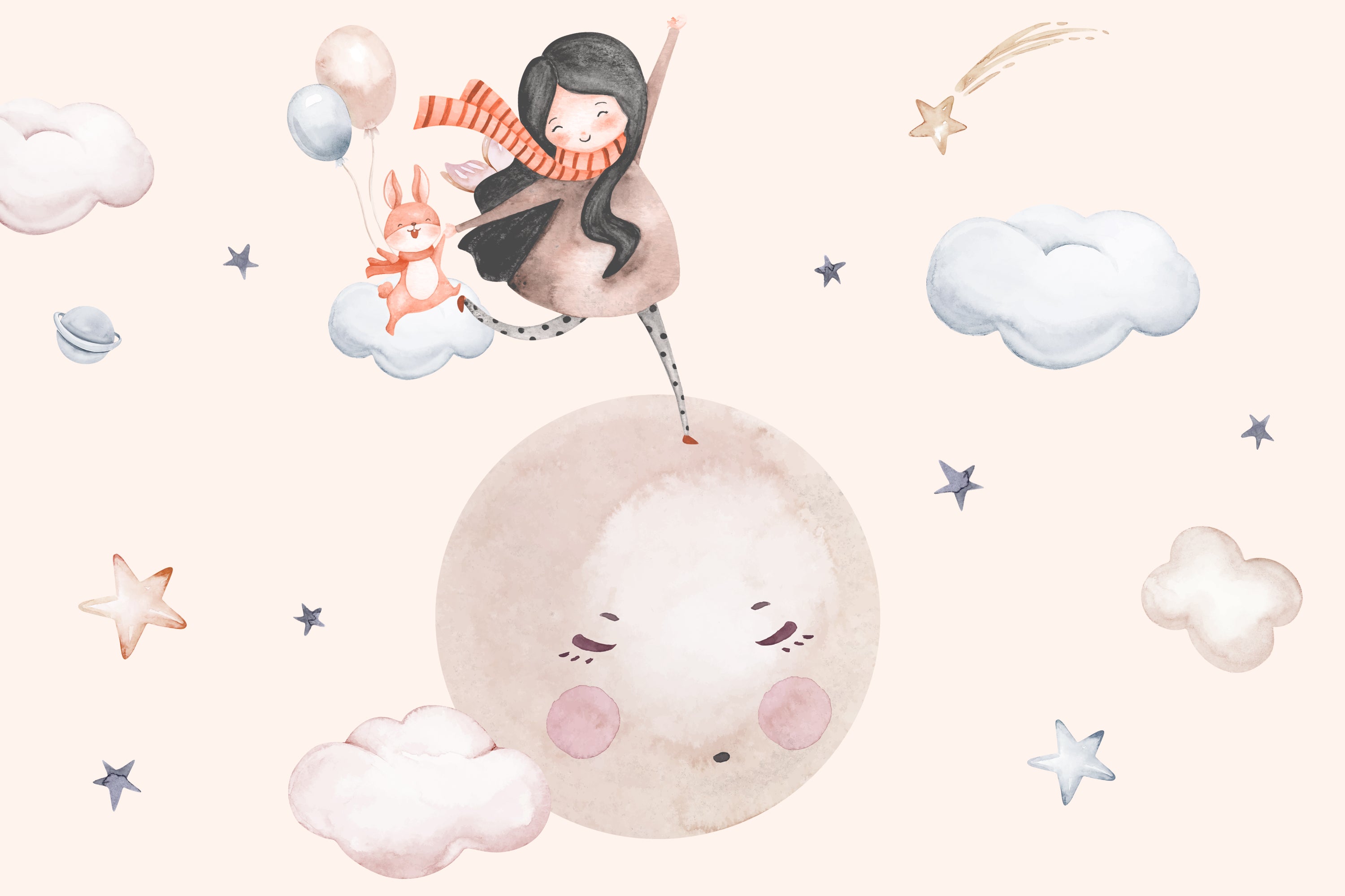 Charming space-themed wallpaper for kids with a floating girl and sleepy moon.