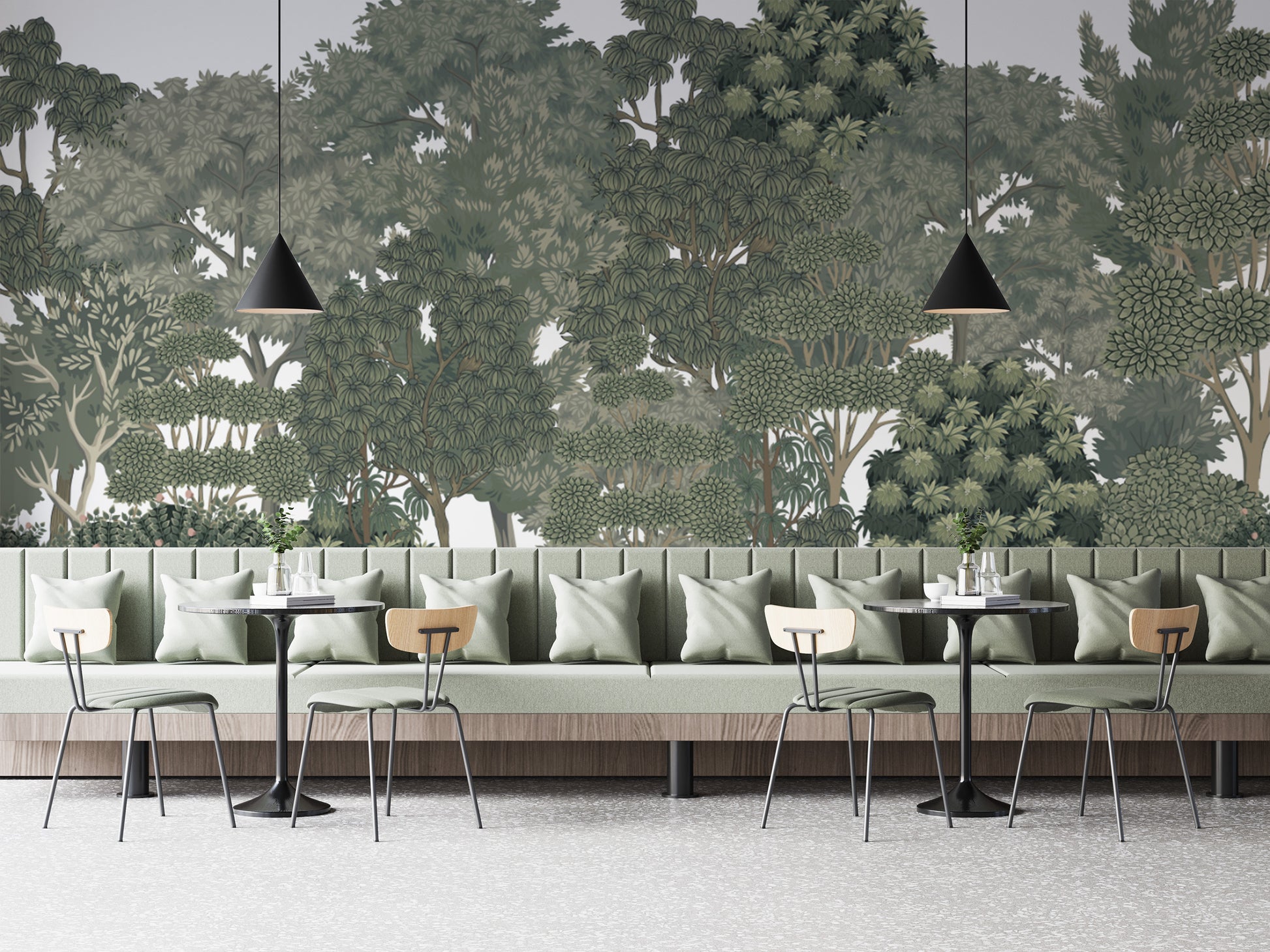 The lush green botanical forest mural brings a refreshing touch with detailed foliage and towering trees. The forest wallpaper mural features layered greenery, creating a serene atmosphere inspired by nature. The green botanical wallpaper highlights hand-drawn trees and lush leaves, making it a perfect choice for bedrooms, living rooms, and offices. The tropical jungle wallpaper blends soft, muted tones with intricate details, offering a stunning natural view. The tree pattern mural provides a timeless look that complements modern and classic interiors. Choose this nature-inspired mural for a refreshing environment filled with greenery and depth.