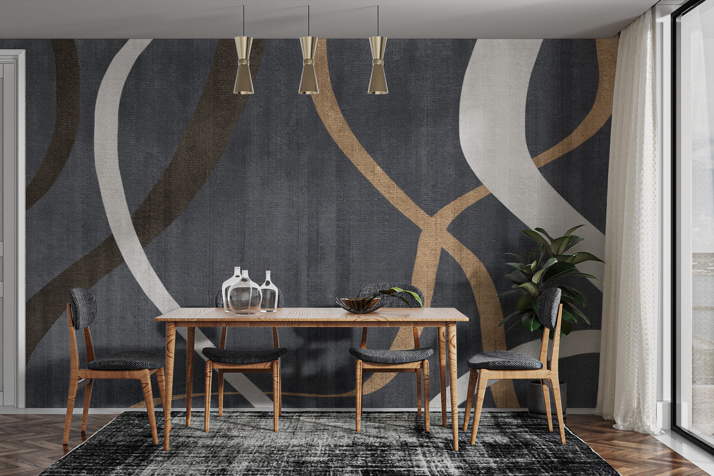 Enhance walls with luxury geometric abstract wallpaper featuring a bold interplay of flowing lines in gold, white, and brown against a dark textured background. The abstract wallpaper design brings a sophisticated touch to modern interiors. The geometric wallpaper pattern complements minimalist and contemporary aesthetics, creating a striking visual effect. High-quality materials ensure durability and a seamless finish. The gold abstract wallpaper accents add a refined contrast, making it a statement piece in any setting. Ideal for living rooms, bedrooms, or offices, this textured abstract wallpaper blends style and luxury effortlessly. Redefine interiors with a sleek and timeless appeal.