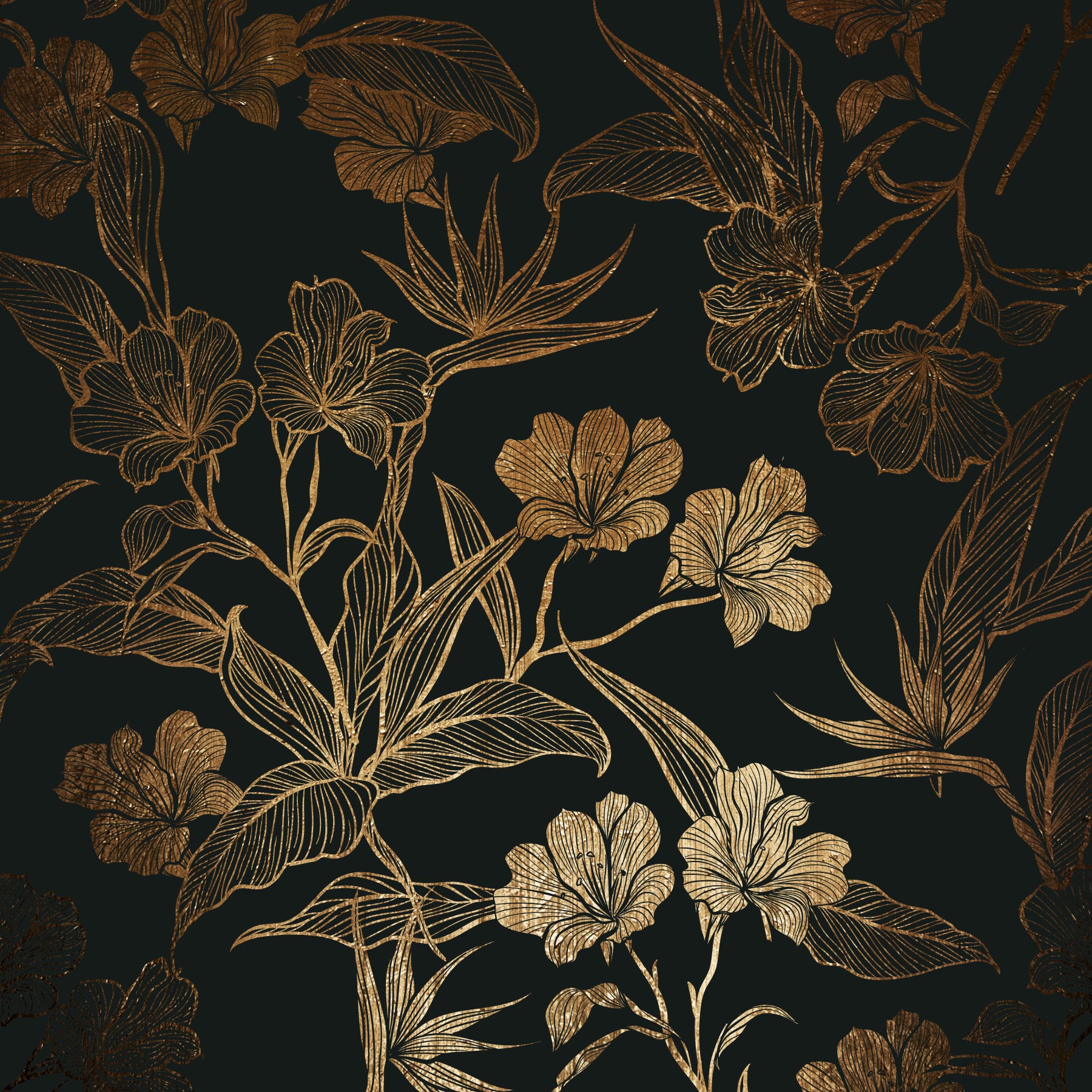 Embrace the allure of the unknown with Madame Noir a wallpaper that whispers secrets and exudes timeless elegance. This design features a captivating dance between light and shadow, where intricate, golden botanical illustrations bloom against a deep, luxurious black backdrop. Imagine yourself transported to a moonlit garden, where exotic flowers and lush foliage are subtly illuminated, their gilded outlines shimmering with an ethereal glow. The textured metallic details add depth and sophistication, reflecting light in a way that enhances the drama and mystique of the design. 'Madame Noir' is perfect for creating a statement wall, adding a touch of opulent drama to any space, and embracing a sense of refined, enigmatic beauty.