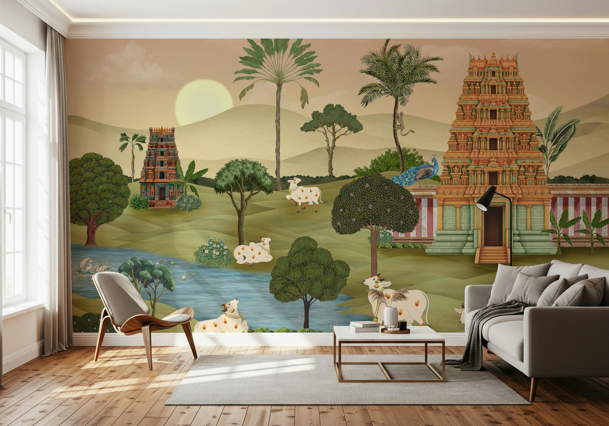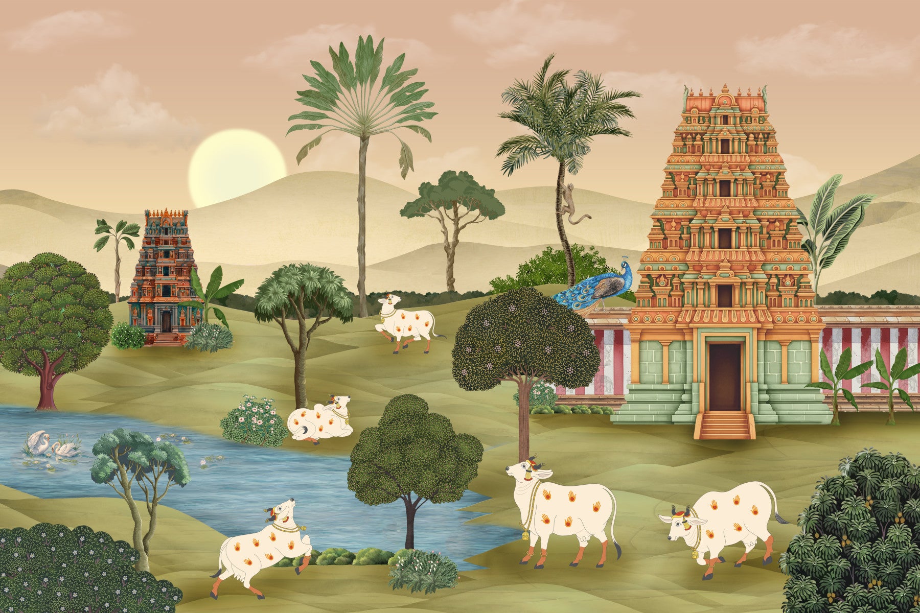 Step into the serene and captivating world of 'Madhuban Moonlight'. This exquisite wall décor transports you to a tranquil landscape bathed in the soft glow of the moon. Ancient temples, adorned with intricate details, stand majestically amidst lush greenery and towering palm trees. Sacred cows roam freely, their presence adding a touch of divine grace to the scene.