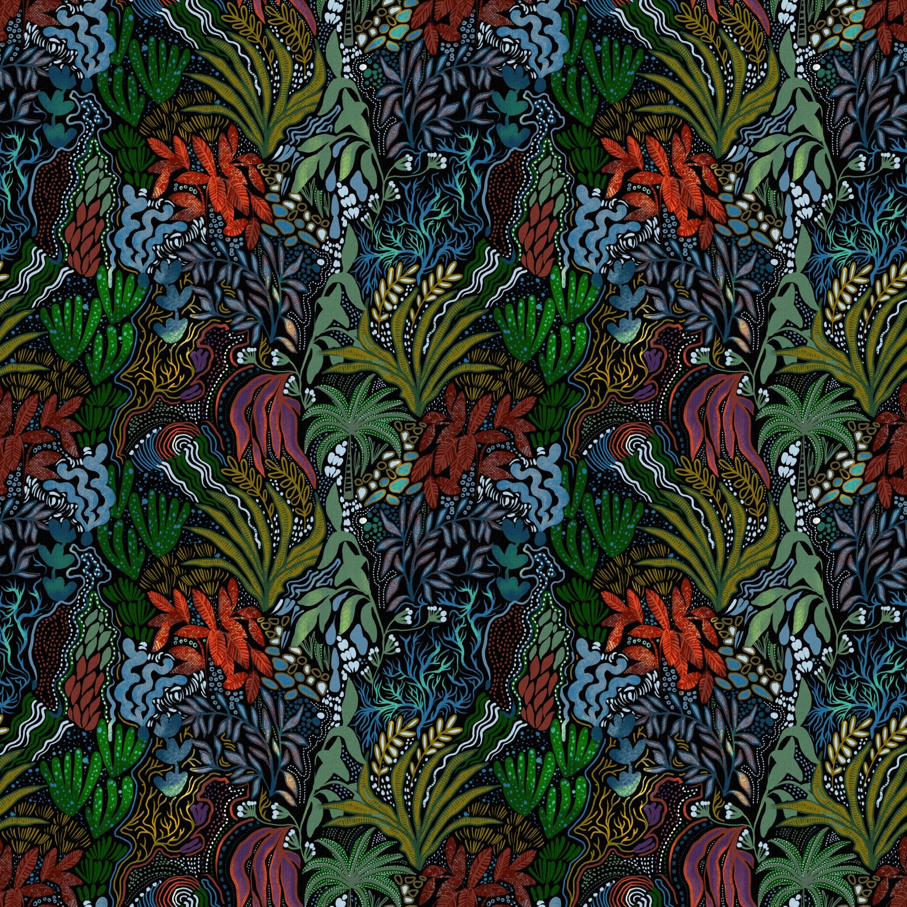 Step into an enchanting world with Magical Night Majestic Garden a wallpaper that evokes the tranquility and mystery of a secret garden under a starlit sky. Deep blues and blacks create a nocturnal backdrop, setting the stage for a vibrant display of stylized flora. Lush, stylized leaves in shades of emerald, gold, and ruby intertwine, creating a dense and visually captivating composition. Hints of moonlight shimmer across the foliage, adding depth and dimension to the intricate details. This wallpaper is perfect for creating a serene and sophisticated atmosphere in any room. Whether you're looking to transform your living space into a peaceful sanctuary or add a touch of whimsy to your office, 'Magical Night Majestic Garden' offers a unique blend of natural beauty and artistic flair. Let this design transport you to a hidden oasis where imagination blooms under the moonlight.