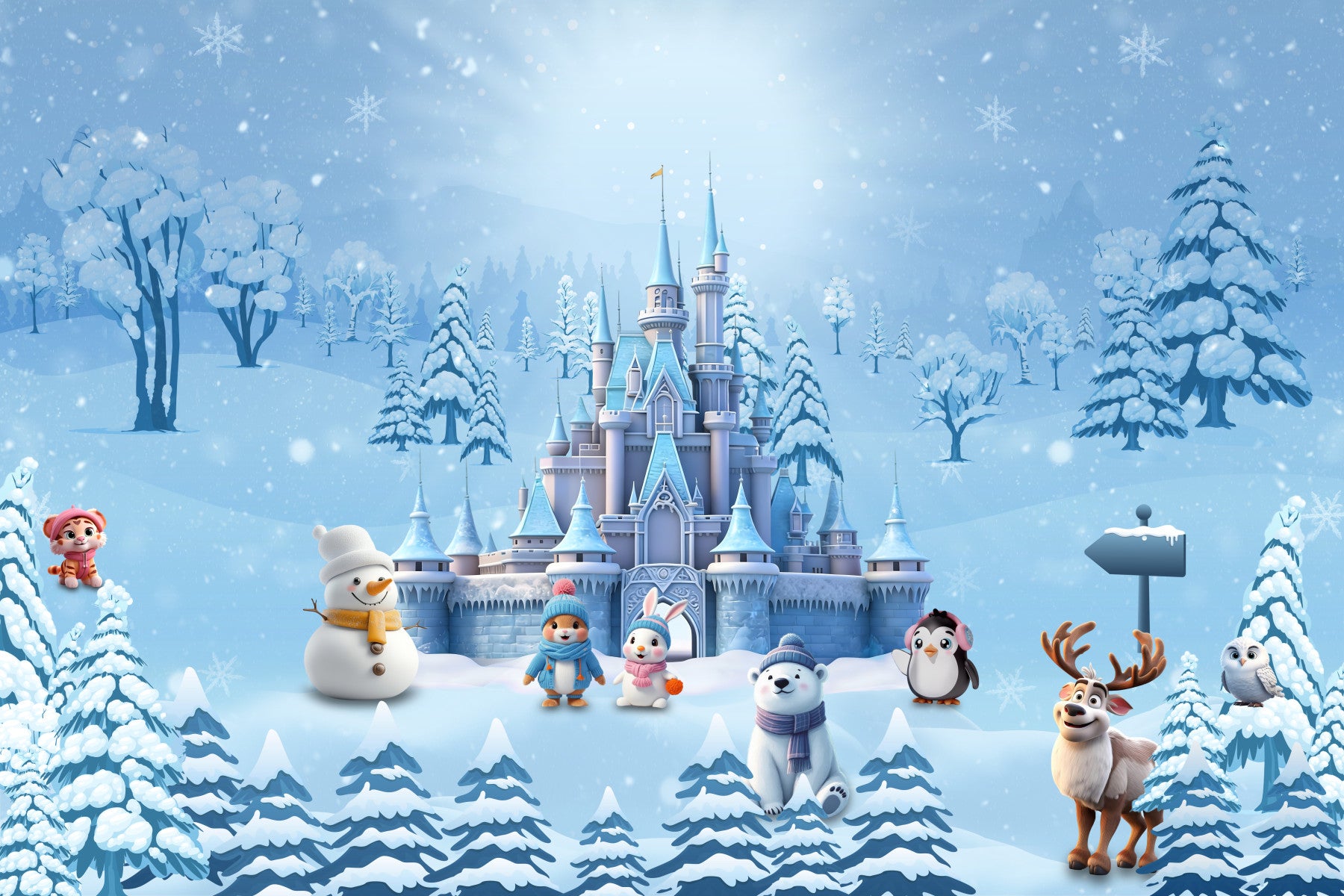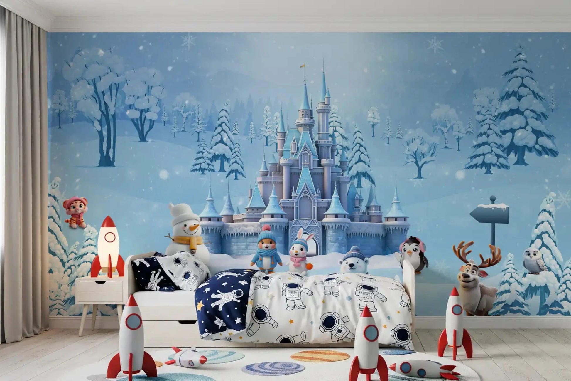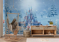 Transform your living space into a captivating winter dream with this enchanting wallpaper for walls. A majestic fairytale castle rises amidst a serene snowy landscape, complete with frosted trees and a gentle snowfall. Charming cartoon animals, including a cheerful snowman, an adorable polar bear, a friendly reindeer, and playful penguins, bunnies, and a tiger cub, inhabit this whimsical scene. The design features a calming colour palette of soft blues, crisp whites, and subtle pastel accents. This delightful pattern creates a joyful and imaginative atmosphere, making it an ideal choice for a child's bedroom, an inspiring playroom, or a peaceful nursery. It instantly infuses any room with wonder and cosy charm.