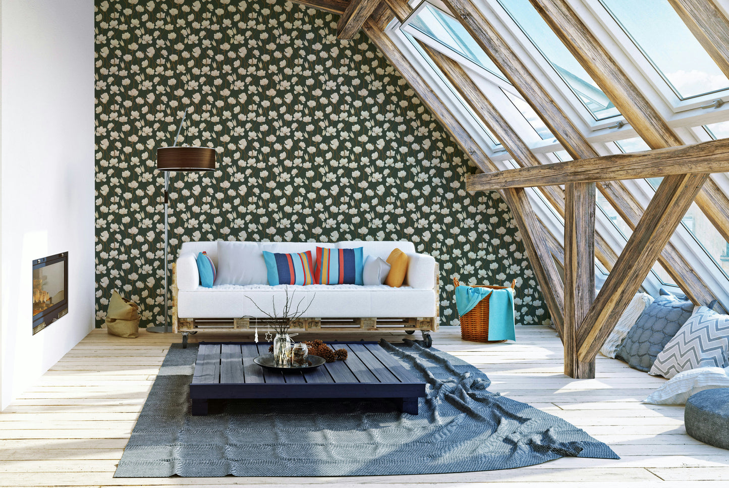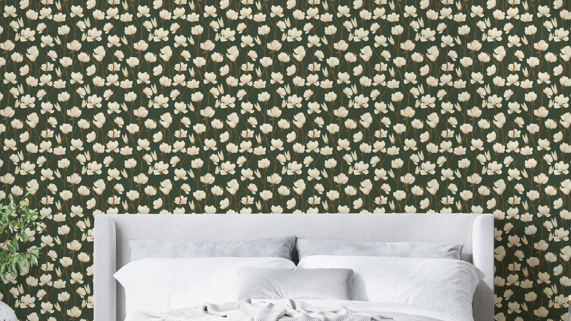 Peel and stick wallpaper with forest-inspired magnolia blooms