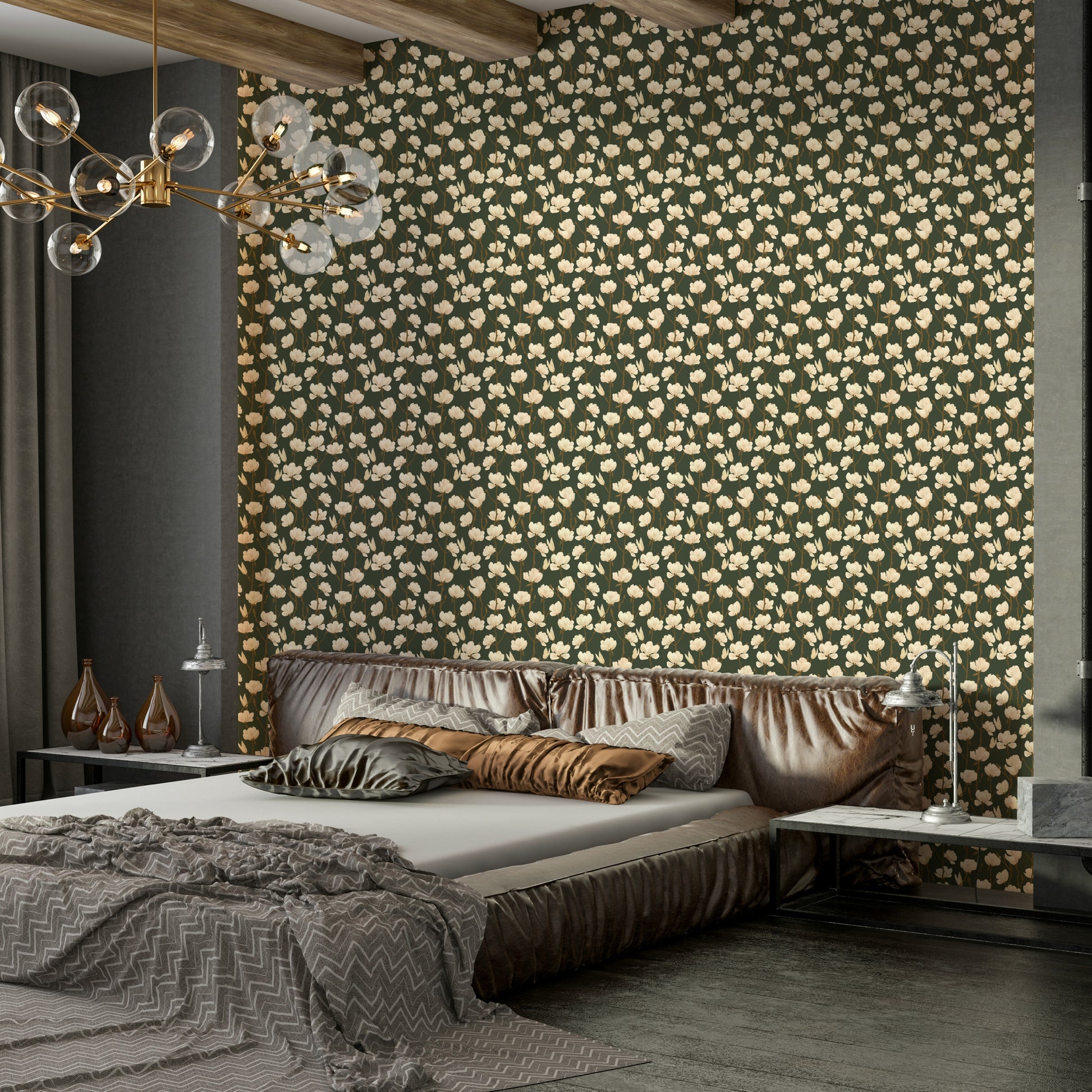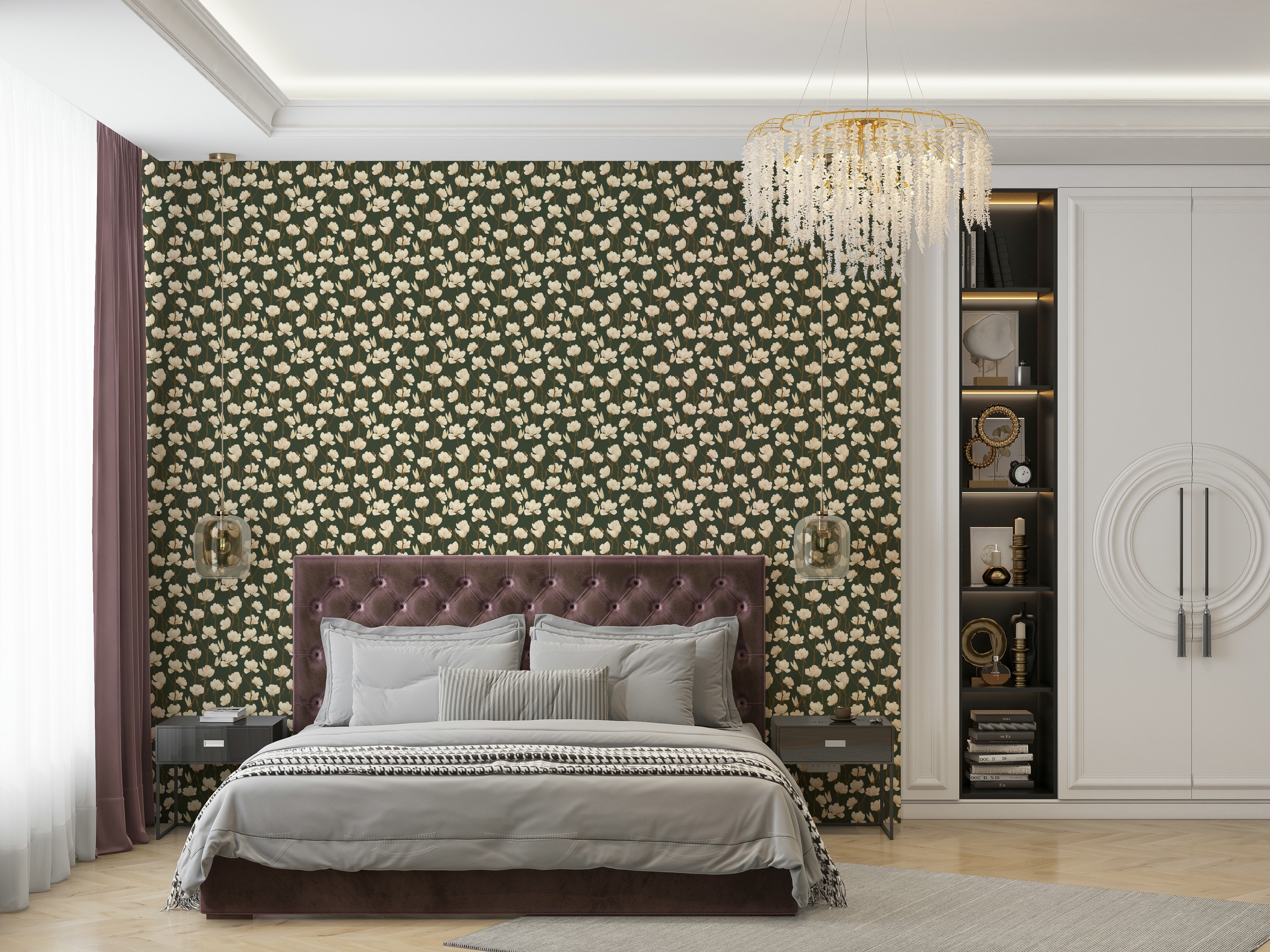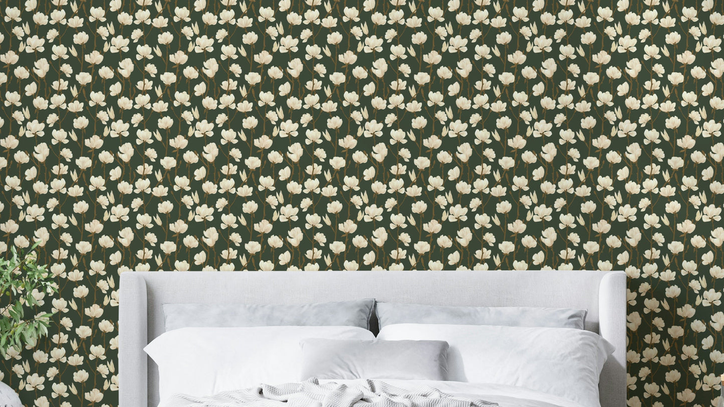 Add depth and warmth to your room with Magnolia Still – Forest Dusk wallpaper. Creamy magnolia blooms unfold along rich brown stems, set against a deep forest green backdrop. The dark background highlights the soft floral tones, making this wallpaper a strong yet elegant choice for bedrooms, dining spaces, or hallways. Its hand-painted look adds an artistic touch while keeping the natural flow of the design intact. Ideal for those who enjoy floral wall design with bold contrast, this wallpaper for walls pairs well with wood, brass, or neutral textiles to complete a refined, nature-inspired look.