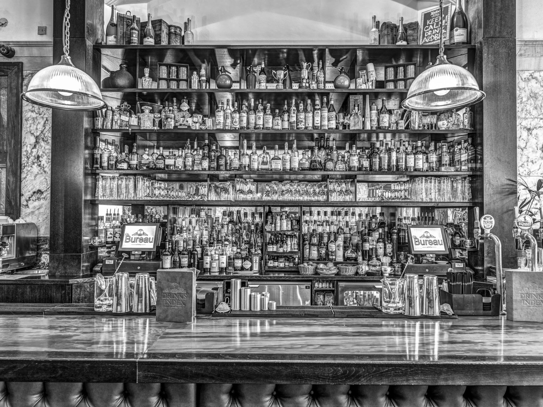 A majestic, detailed image of a grand bar spreads across your wall with the Majestic Bar Wall Mural. This classic mural wallpaper has a detailed, black and white design that gives your space a sense of quiet elegance. The many bottles, glasses, and the polished bar top of this beautiful wallpaper for walls will make any room feel both grand and sophisticated.