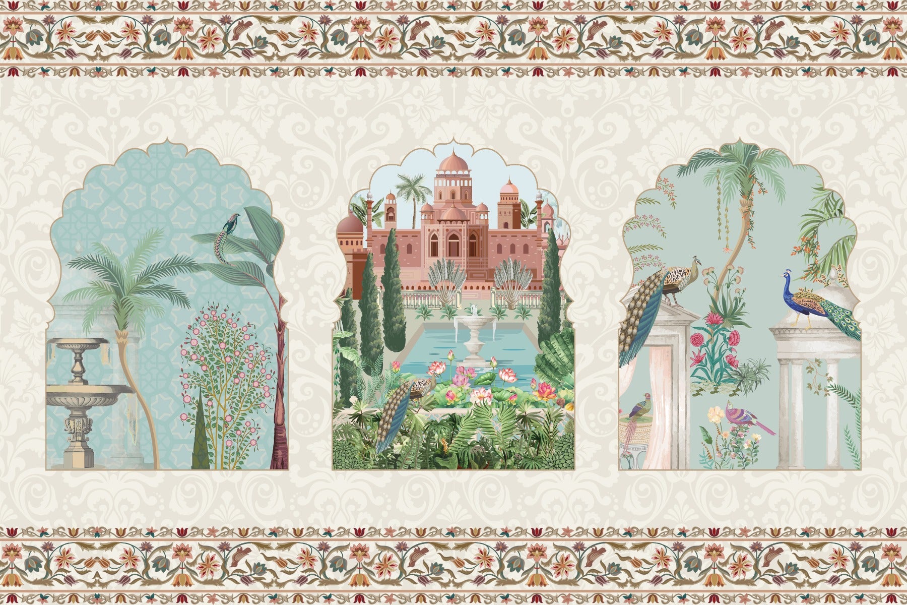 The majestic palace gardens mural is a splendid portrayal of regal splendor and botanical beauty. This mural wallpaper transports you to the stately courtyards of Indian palaces, where every view is a tableau of historical elegance. With its vintage peel and stick wallpaper charm, it features intricately detailed peacocks perched atop classical architecture, set against a backdrop of lush, verdant flora. Each mural panel is a testament to the artistry of bygone eras, inviting a sense of nobility and grandeur to envelop the beholder. It's a piece that doesn't merely decorate a room but weaves a narrative of royal heritage and opulent gardens. Ideal for those who value the sophistication of historic motifs, the majestic palace gardens mural is more than just decor it's a passage to the past, celebrating the timeless allure of India's majestic landscapes and rich culture.